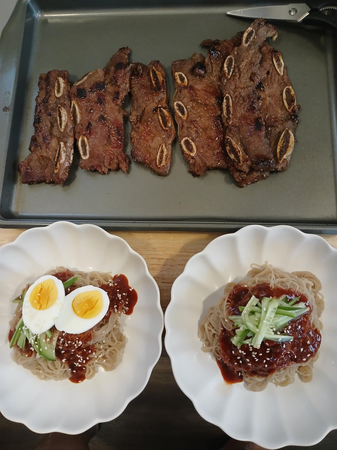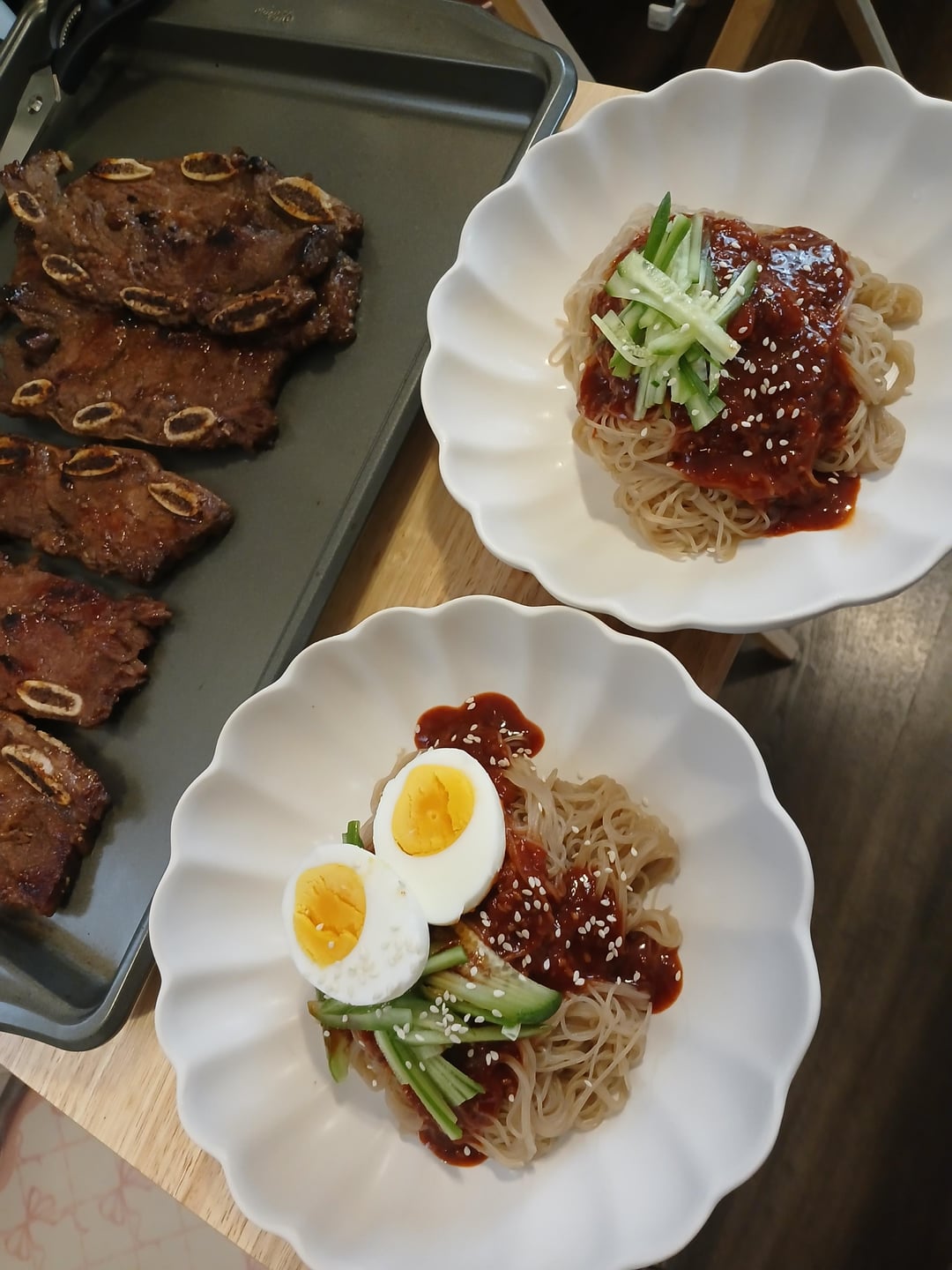 Absolute summer dinner vibesLA galbi with bibim naengmyeon? That sauce looks gochujang-y. Did your mom use the classic soy, garlic, asian pear marinade, or something secret i should try?