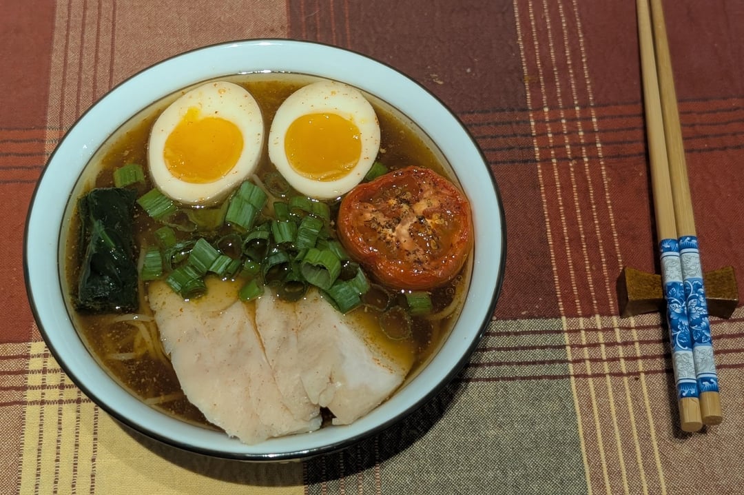 Made after studying the Book of Ramen from this sub. Tokyo style chintan, standard shoyu tare, chicken & scallion oil, sous vide chicken breast, ajitama egg, spinach, scallions, and toasted tomato