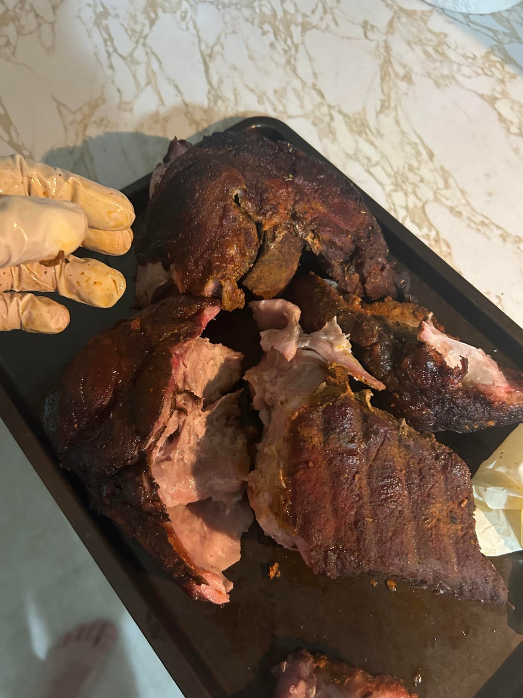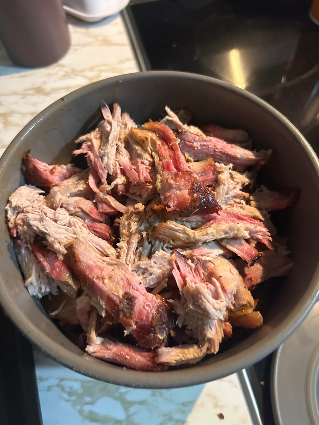 That does not mean it’s done tho when it reaches that temp. The bone should pull freely from the shoulder. Allow to rest for a bit and shred. If usually cut off a hunk and then shred it and cover the rest until I need to shred more as it’ll dry out quickly unless you’re adding BBQ sauce to the whole thing shredded and you’re serving a lot of people. I don’t shred and add bbq sauce to the whole thing because I use leftovers for different things like fried rice etc and I don’t want that sweetness. Your choice tho