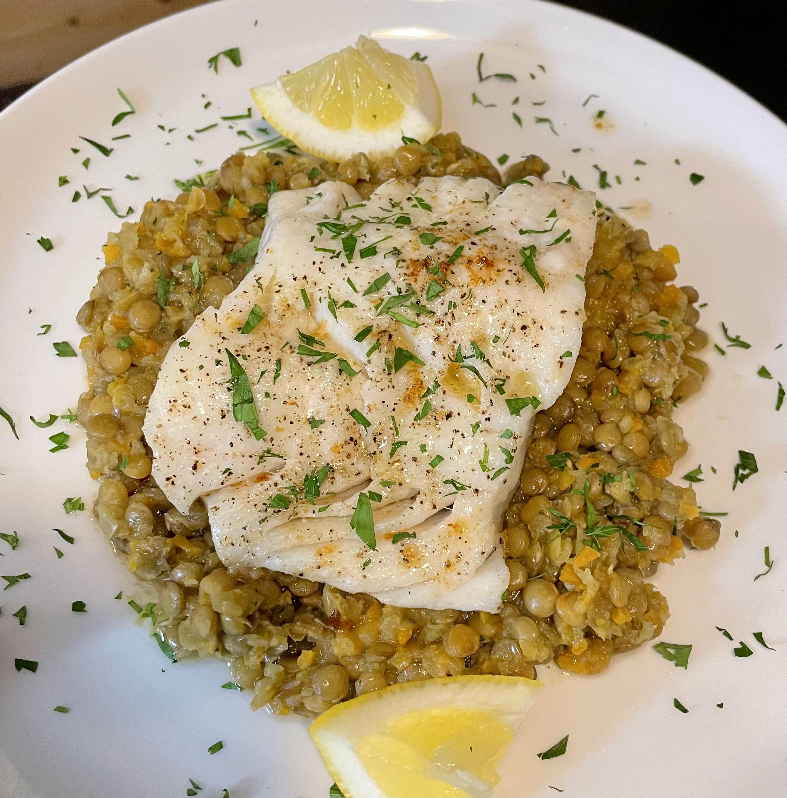French bistro classic: Pan roasted fish (haddock here) over lentils