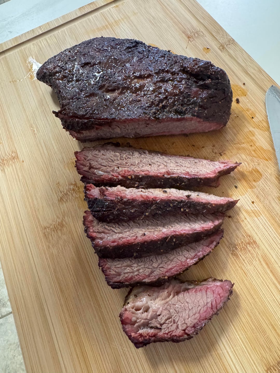 Did a whole brisket in July but this is the first flat. 2.5 pounds. Good enough for 4 people with ample sides though. $25 at Walmart.