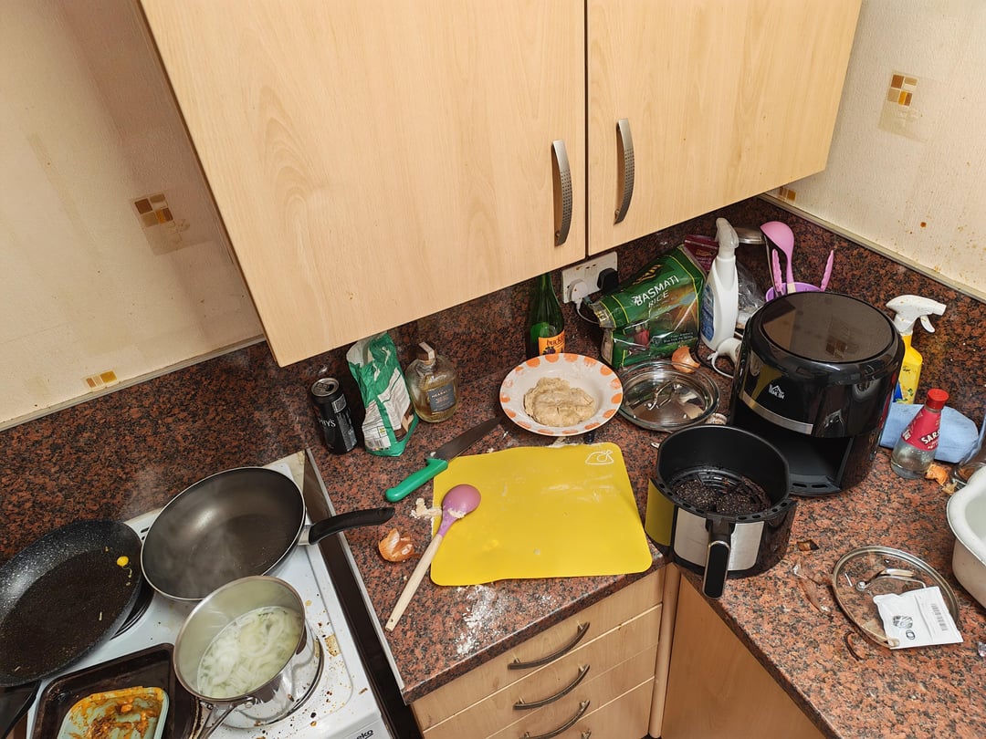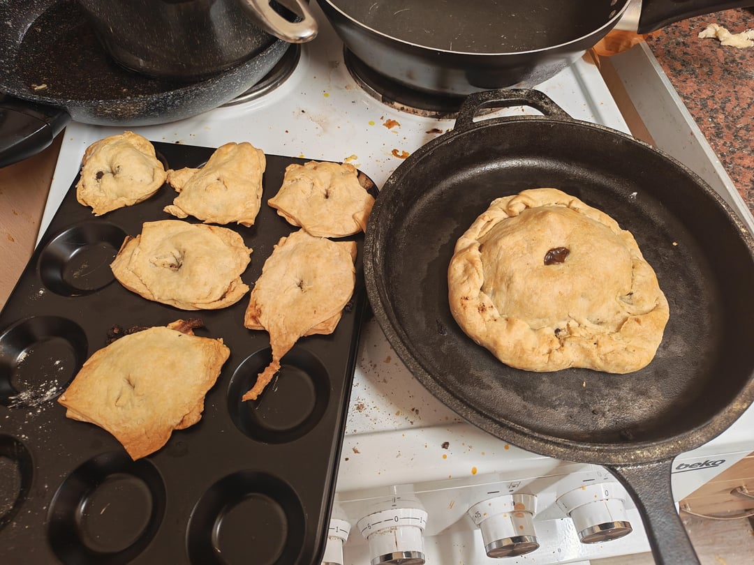 No butter, impovosed, oil, flour hot water pastry. Defrosted ancient black pudding, threw some tatties, onion and buckfast in a pot to get to know each other before throwing in black pudding, mixing very lightly to keep consistency, then throwing that in vaguelt shaped thrown together pastry on whatever shapes I could find for oven.