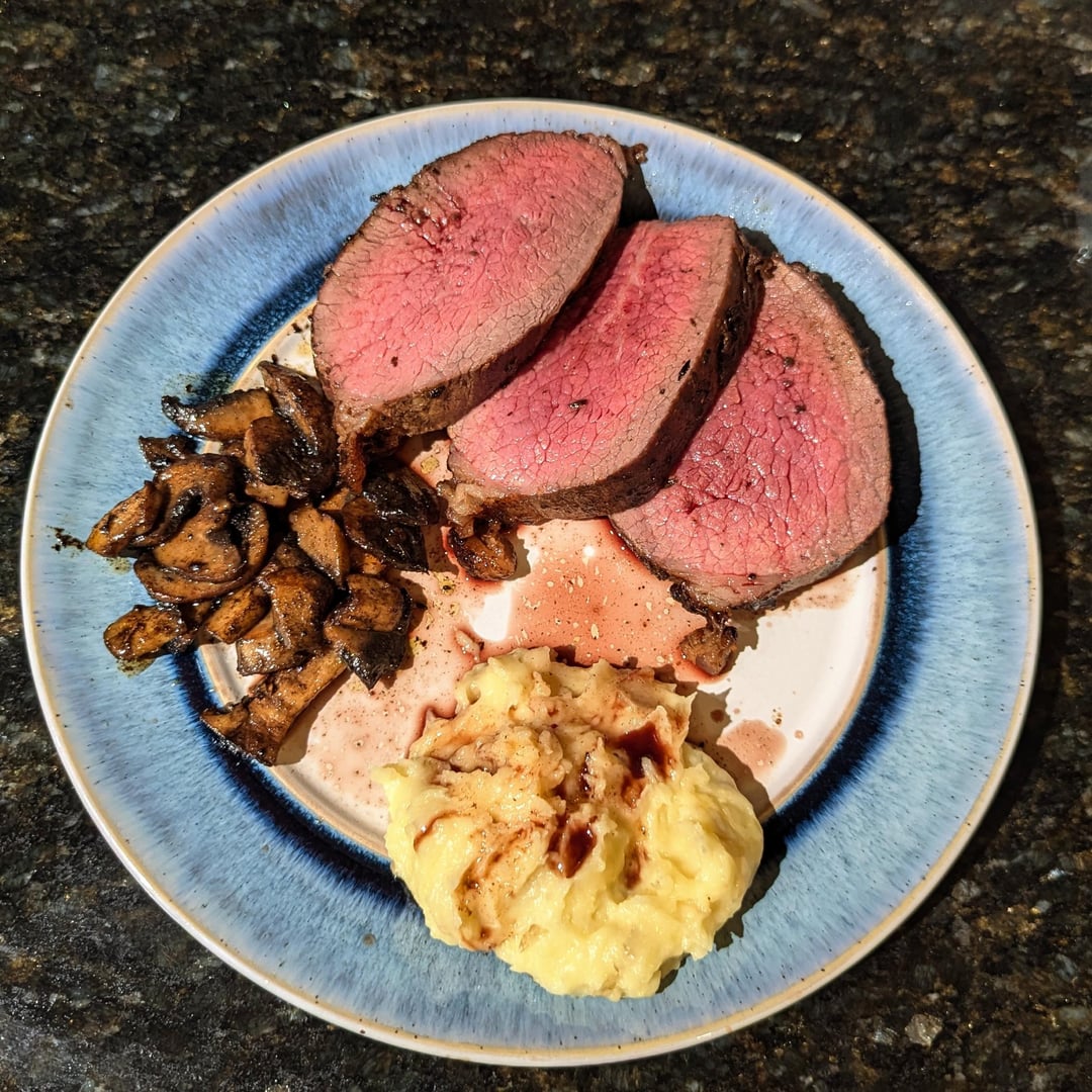 Started in the oven at 275 for 25mins, then seared in a cast iron on high, with a final internal temp reading at 140-145. Served with mashed potatoes and sautéed mushrooms ❤️