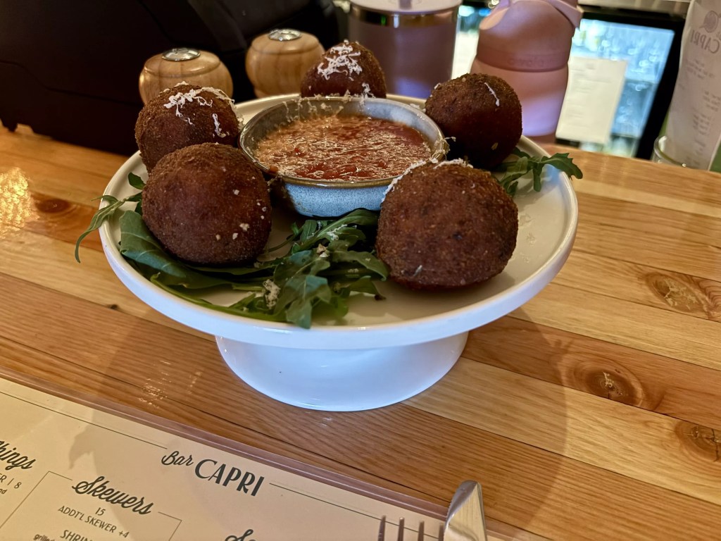 A cake stand filled with arancini is the perfect way to start your meal at Bar Capri.