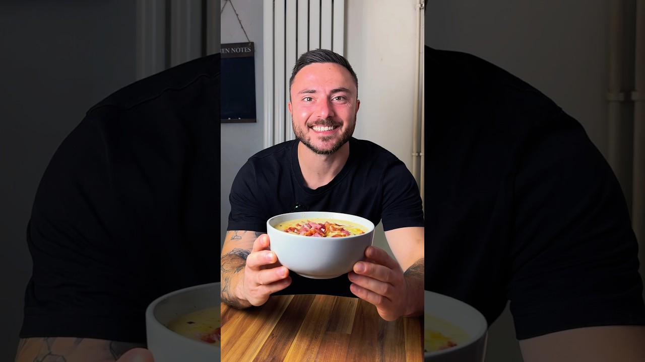 If you only have 30 minutes for dinner, but you want something healthy and comforting in this colder weather, you need to make this cheddar and broccoli soup. We’re going to start by chopping up the broccoli and grating the carrot. And then we’re going to dice an onion. Then finally, chop some garlic. Melt some butter in a pan. Add the carrot, the onion, and the garlic with a pinch of salt. Let this cook for 8 minutes. Add a tablespoon of flour. This will help thicken the soup. We want to let the flour cook for about a minute just so it doesn’t have that flowery taste. Then pour in some chicken stock. Add the broccoli. Let this simmer for 12 minutes. Then remove a quarter of the soup. Blend it smooth. Then add it back into the pan. Add some cream, cheddar cheese, some mustard, woristers sauce, mixy mixy. Once the cheese has melted, serve it in your bowl with black pepper, cheddar cheese, and crispy bacon. Look at that. That is absolutely banging. Lovely.