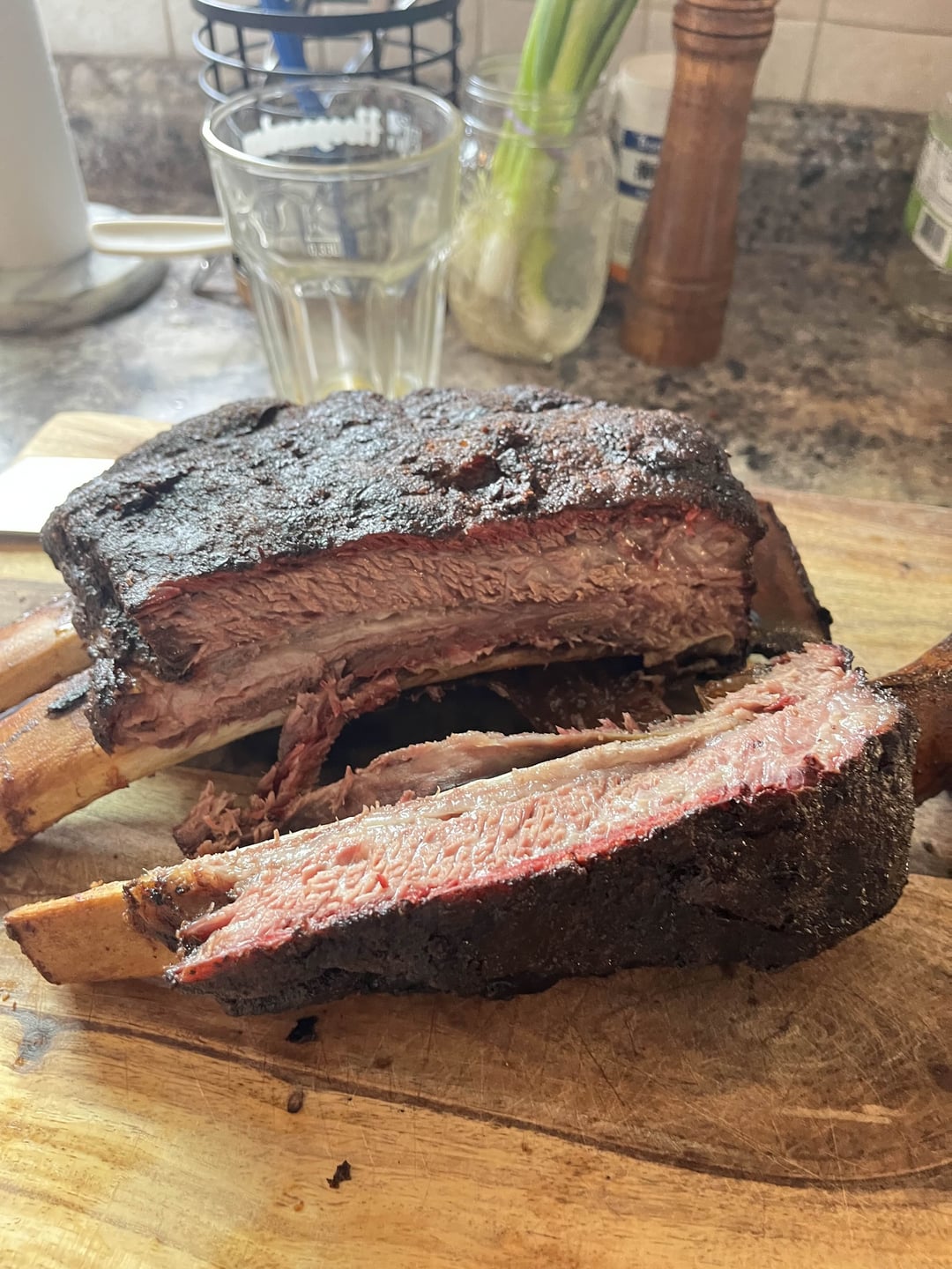 I know them as Dino ribs I’ve done them twice and both times great bark and bone pulled right out of meat ,melt in your mouth. The guy at butcher shop suggested using rub called Dusted basically charcoal and salt adds amazing bark and flavor. I did mine at 225 for six hours ,uncovered first 3 hours ,wrapped last 3 hours . Your bark looks pretty darn good though. Looks yummy 😋 😍