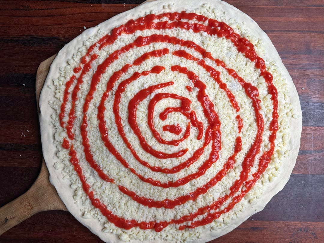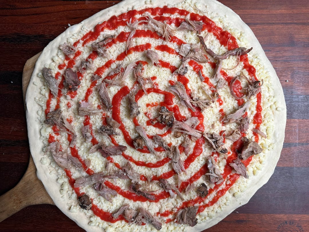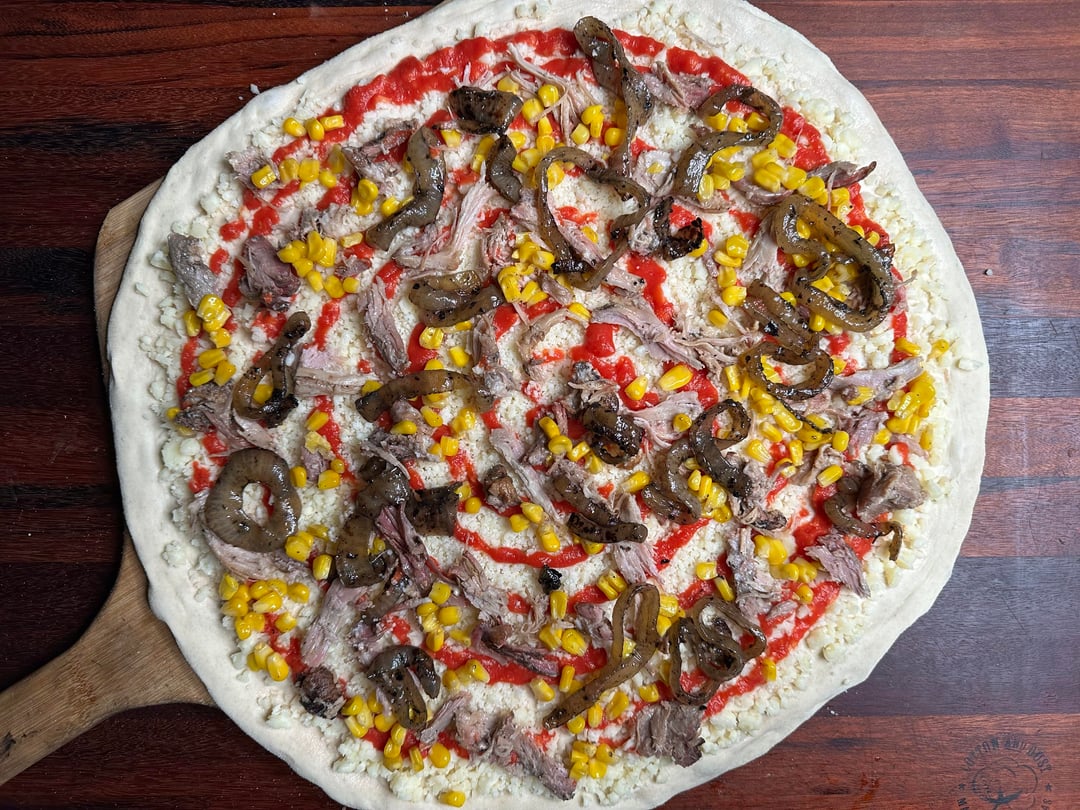 Pizza night! This week’s special included some pork I smoked a couple of days ago. It had mozzarella and cheddar, tomato sauce, grated Pecorino Romano, smoked pulled pork, sautéed corn, charred onions, and bacon crumbles. Finished with fresh cilantro, scallions, and a swirl of Cuban Frita burger sauce, which is pretty much like bbq sauce.