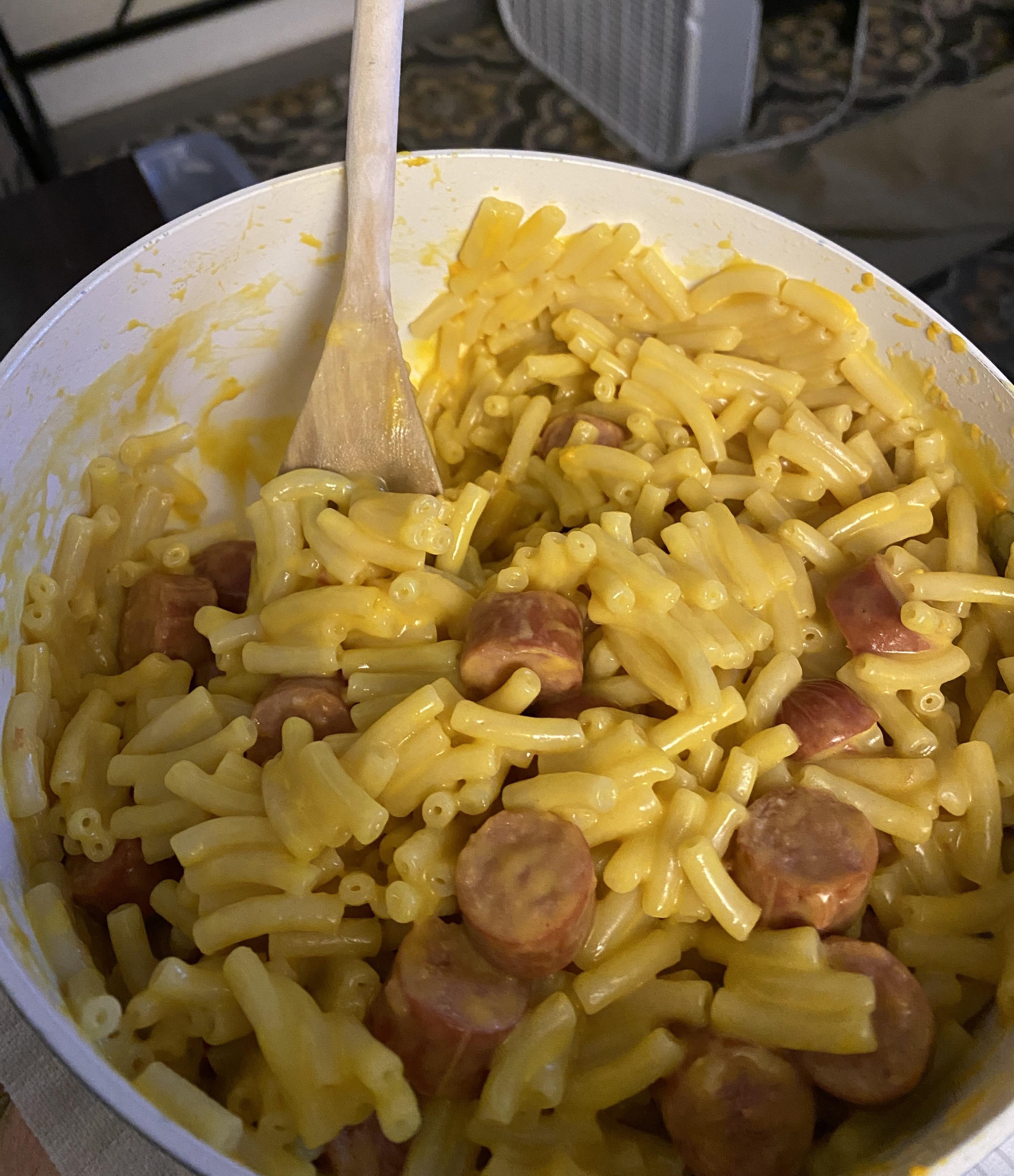 I one up this dish by browning the hotdogs with some onion before putting it in the mac.