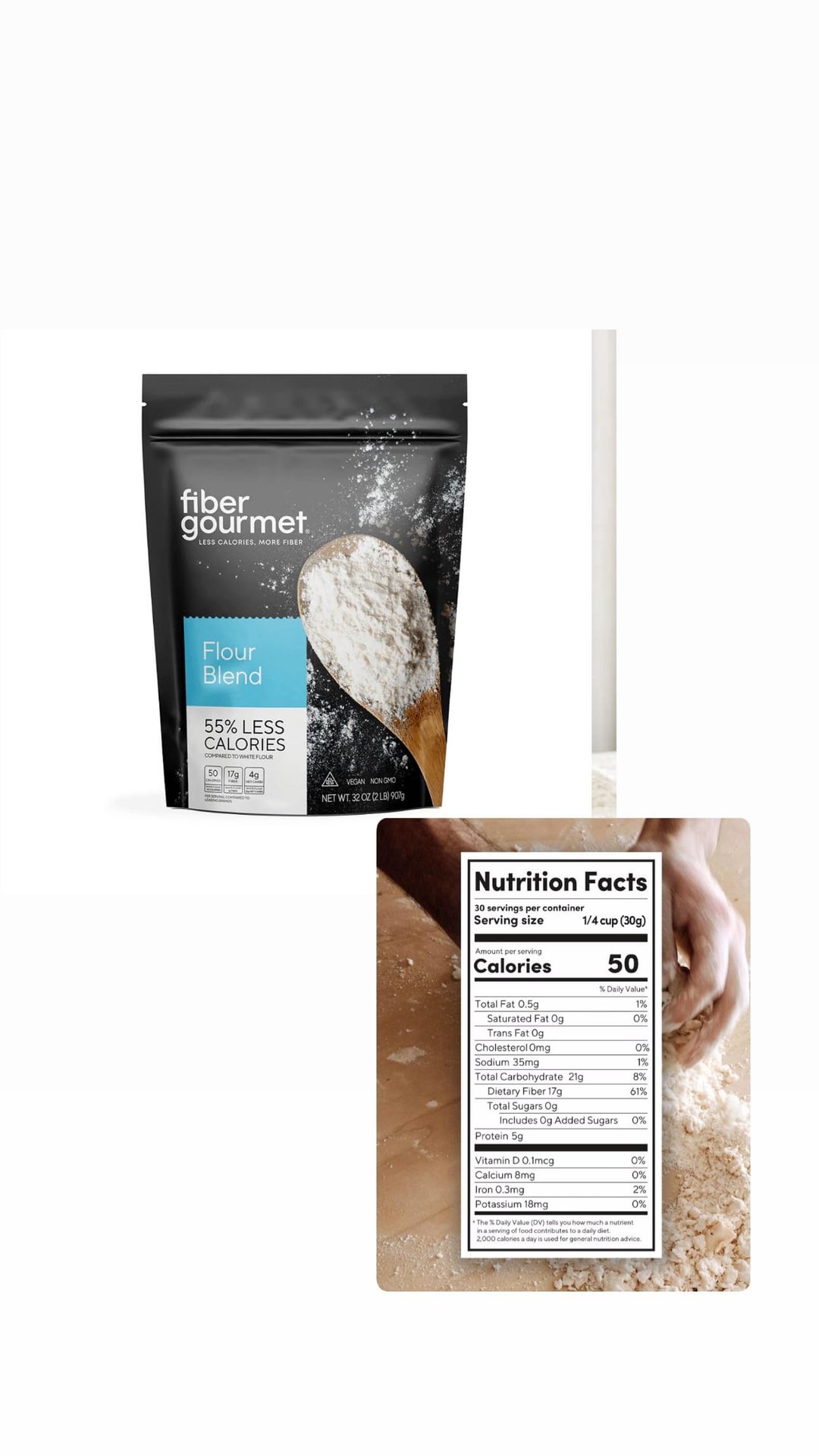 Fiber gourmet flour blend – per 30 g 50 kcalo 0,5 g fat 21 g carbohydrates 5 g protein