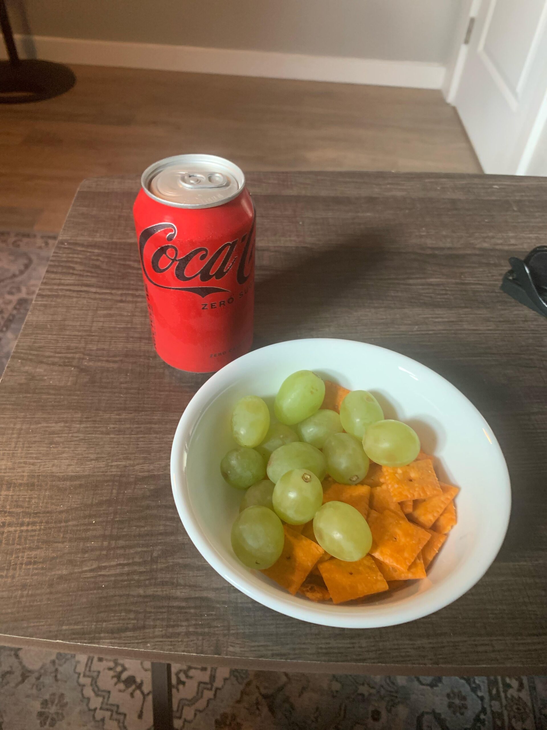 Genuinely think the back and forth sweet and salt poo from the grapes and cheeze it’s sounds great, with some sweet sweet carbonated beverage on the side. Good snack choice all around I think
