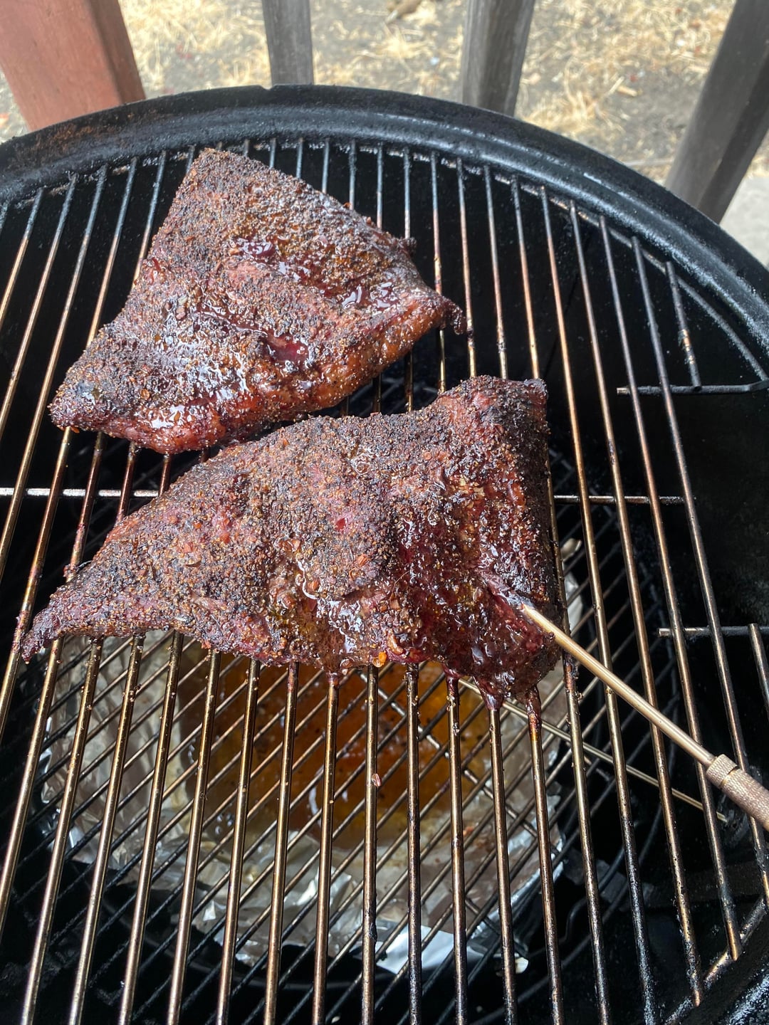 Smoked between 225-250 with cherry til about 185 and then wrapped and finished in oven til 203-204. Considering braiding them a bit more with a thyme/red wine bath but they taste great as is.