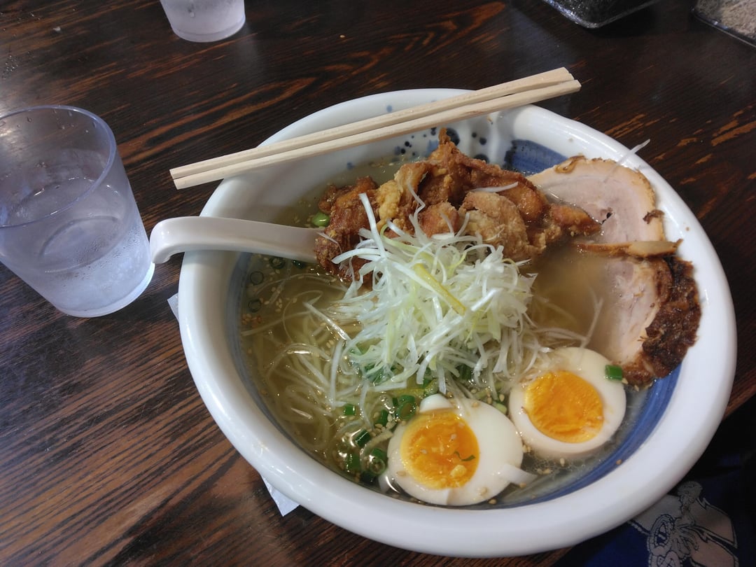 "My Own style Manly Ramen" with deep fried chicken, char SIU, and eggs. I keep ordering this one. They have 2 versions of this, one with a thick brother and one with a clear broth. This company has two shops within a stone's throw of each other.