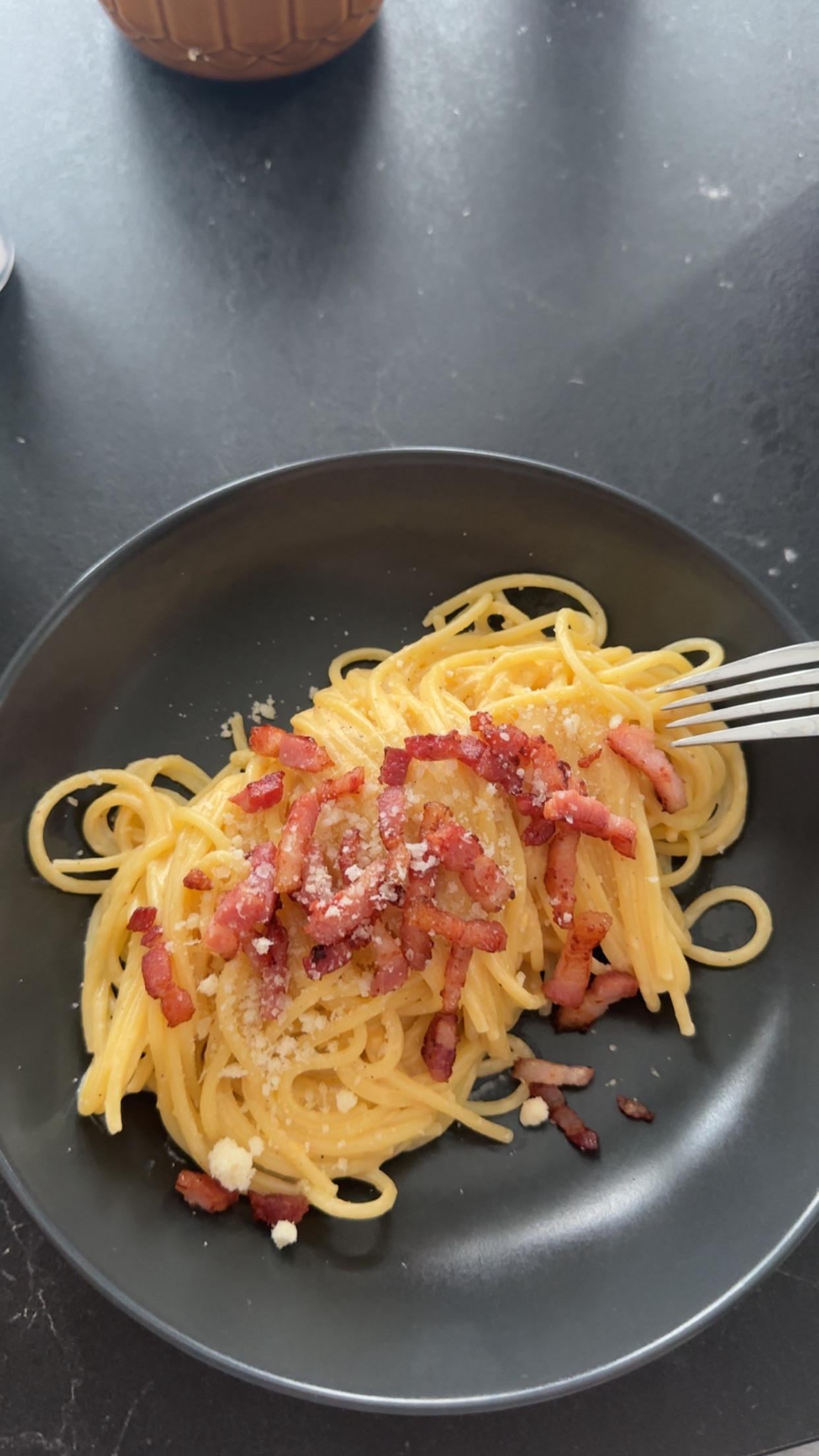 egg yolk , parmesan cheese, bacon ๐Ÿ˜๐Ÿ˜