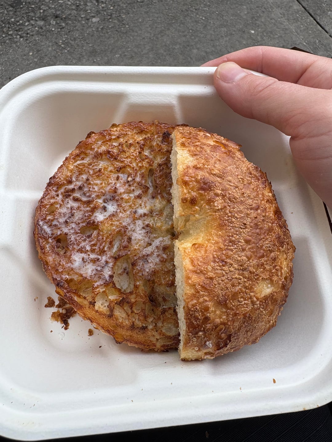 -I had a plain bagel with butter there and it was exactly what I needed. Maybe one of the best bagels I’ve ever had. I froze these when I got home and I’m gonna have to try hard to eat one of these everyday till they’re gone.