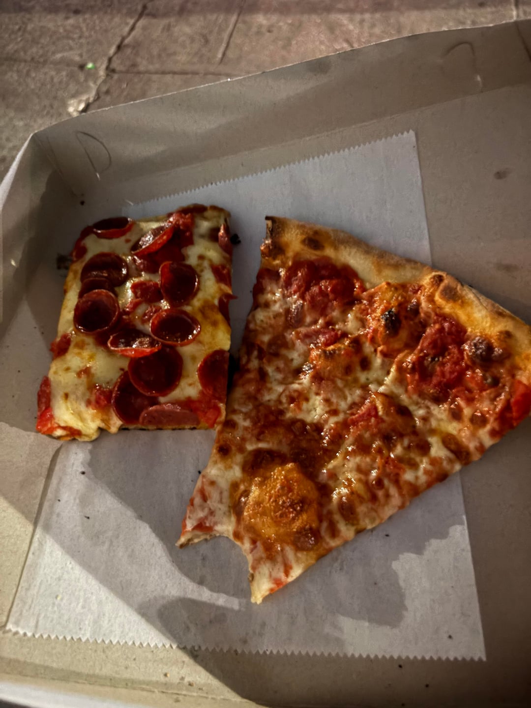 -I asked for a cannoli and the guy said “I just made these”. It had chocolate chips and pistachios in it. Shell was perfectly crunchy and filling was great. Made me want to go back and try other cannoli flavorsScar’s Pizza-Cheese slice, pepperoni Sicilian