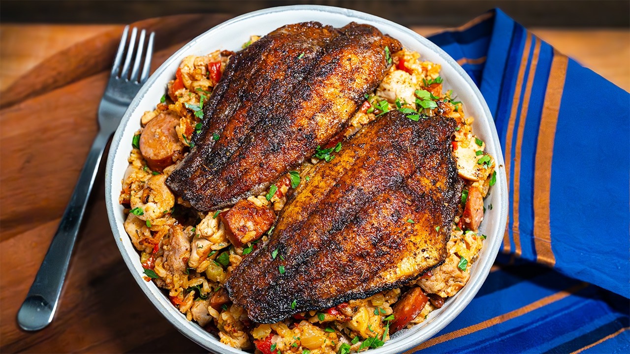 We call that a Ponchatrain where I'm from, 2 catfish fillets over jambalaya or dirty/cajun rice.