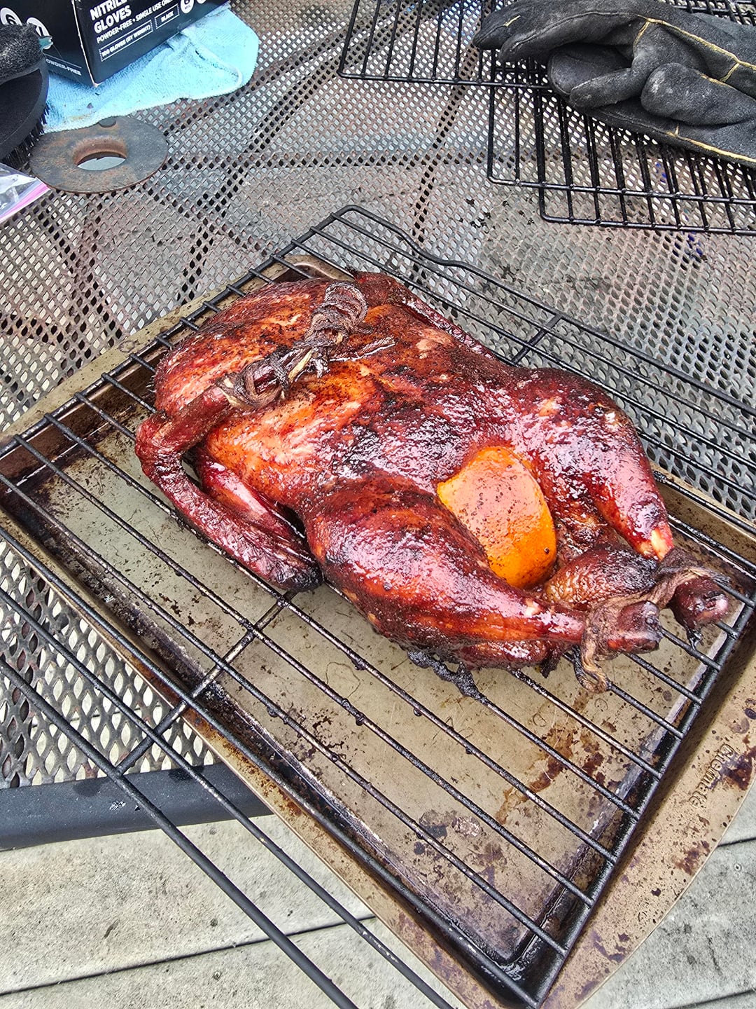 Soy honey orange glazed duck smoked at 325-390 for a little over 3 hours