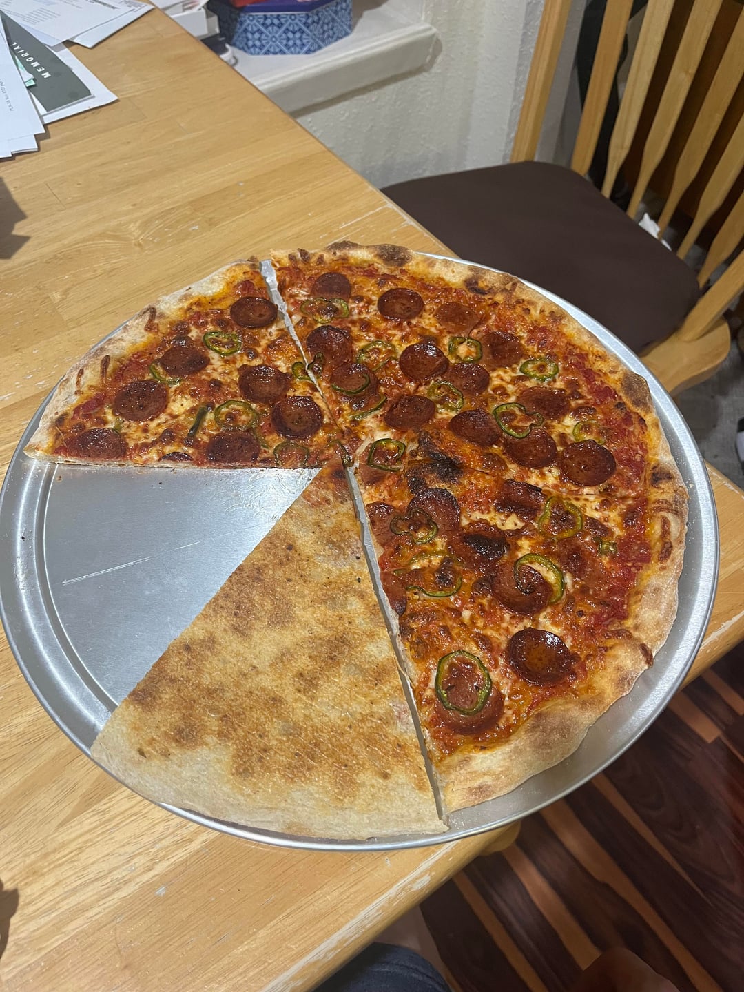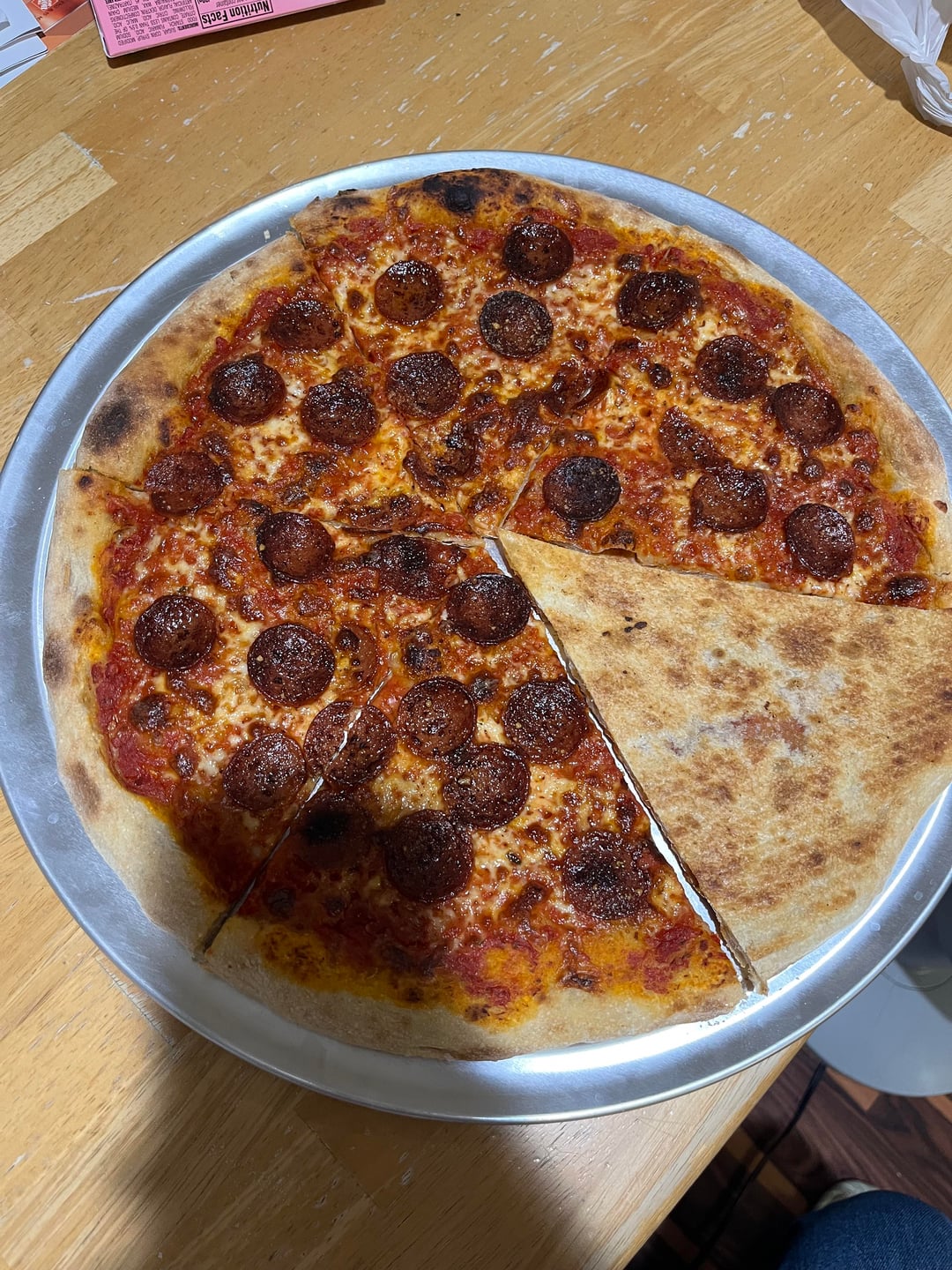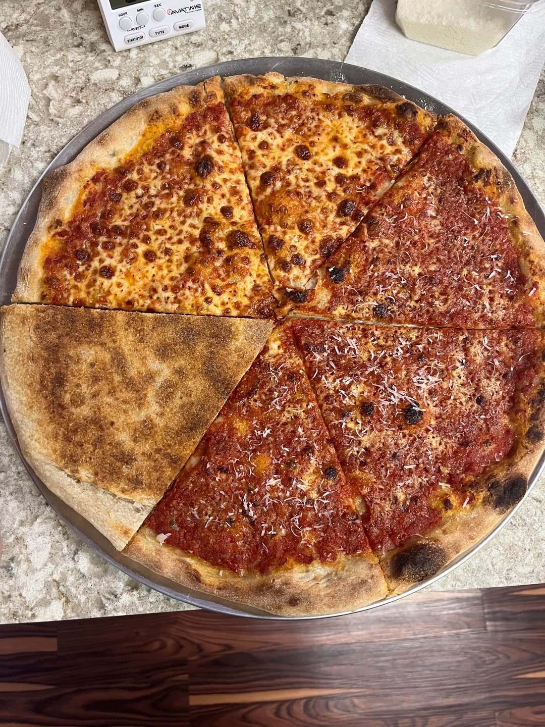You should get another cutting board big enough for your pizzas. It’s much better and the life of your steel will be so much longer if you don’t cut into the steel for each pizza lol. I worked around pizza for a long time and if my boss saw you do that had flip a shit 😂 even though we had like 40 steels, it dulls your cutter, you’re ruining the steel, and you could possibly get some metal shards in a slice worst case scenario. Aside from that, first 2 look perfect, third one looks overcooked. Keep up the good work op
