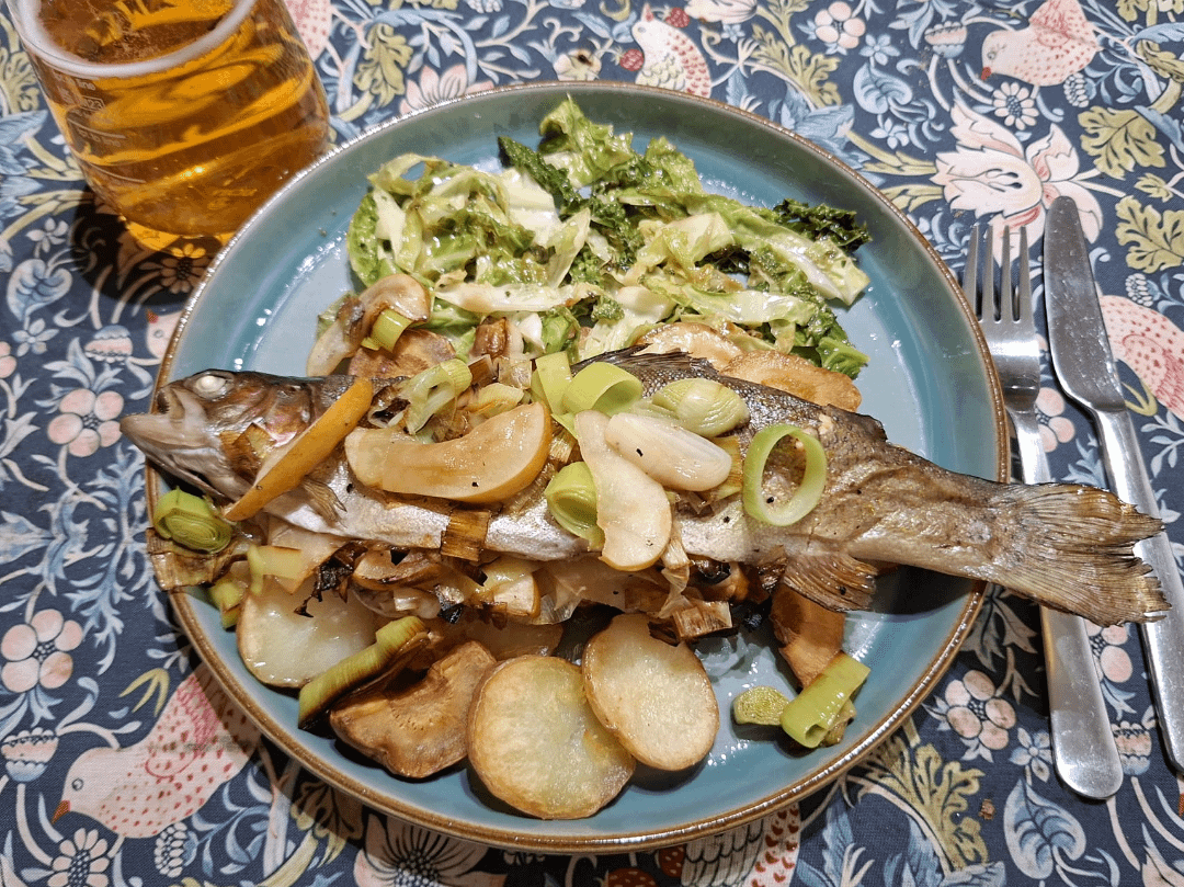Roast rainbow trout stuffed with russet and leek, braised cider cabbage and thick potato and parsnip chipsby Spichus Dining and Cooking