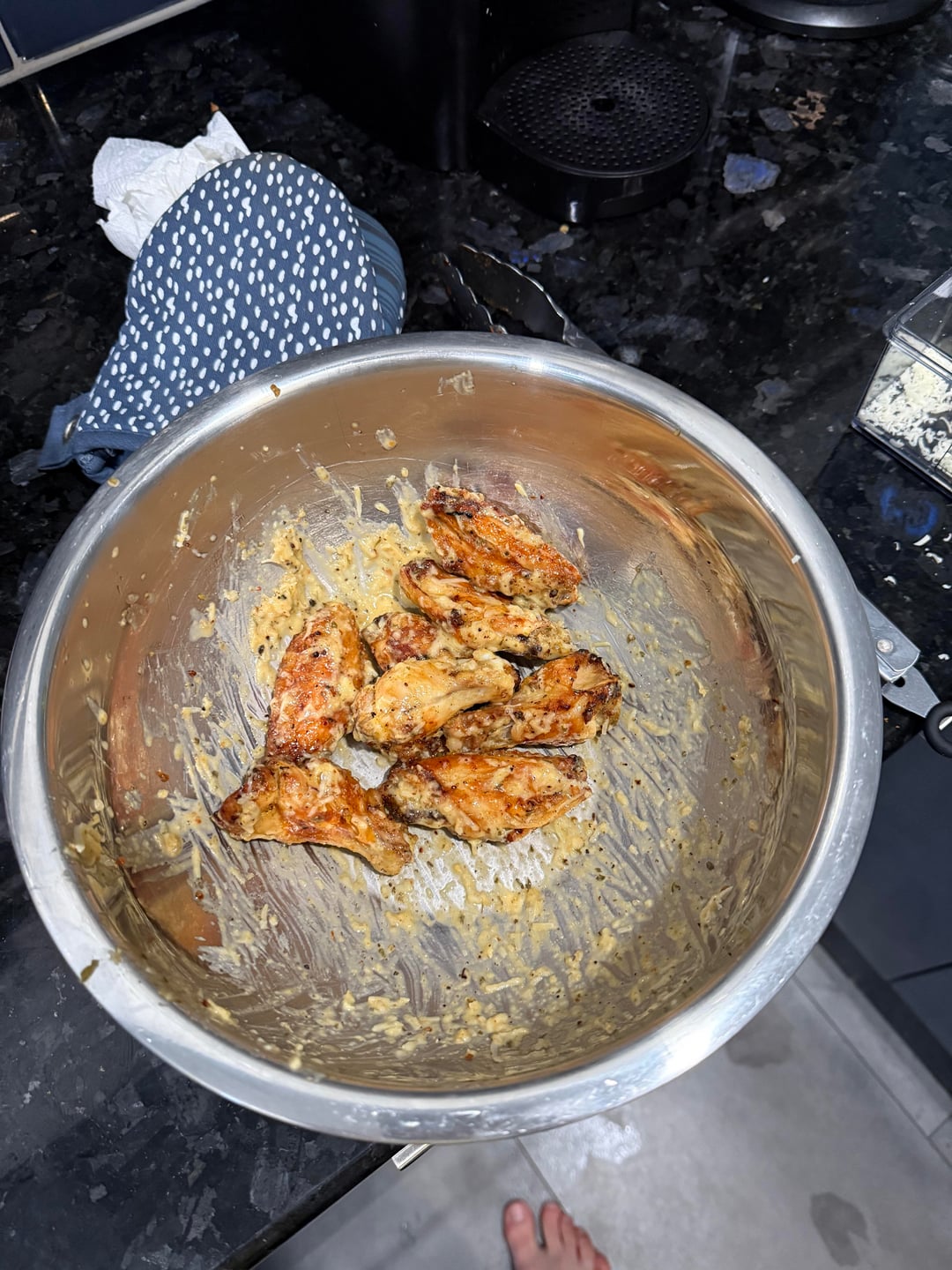 1st half was a gold bbq sauce mixed with secret aardvark second was garlic parm with parm sprinkled on top.