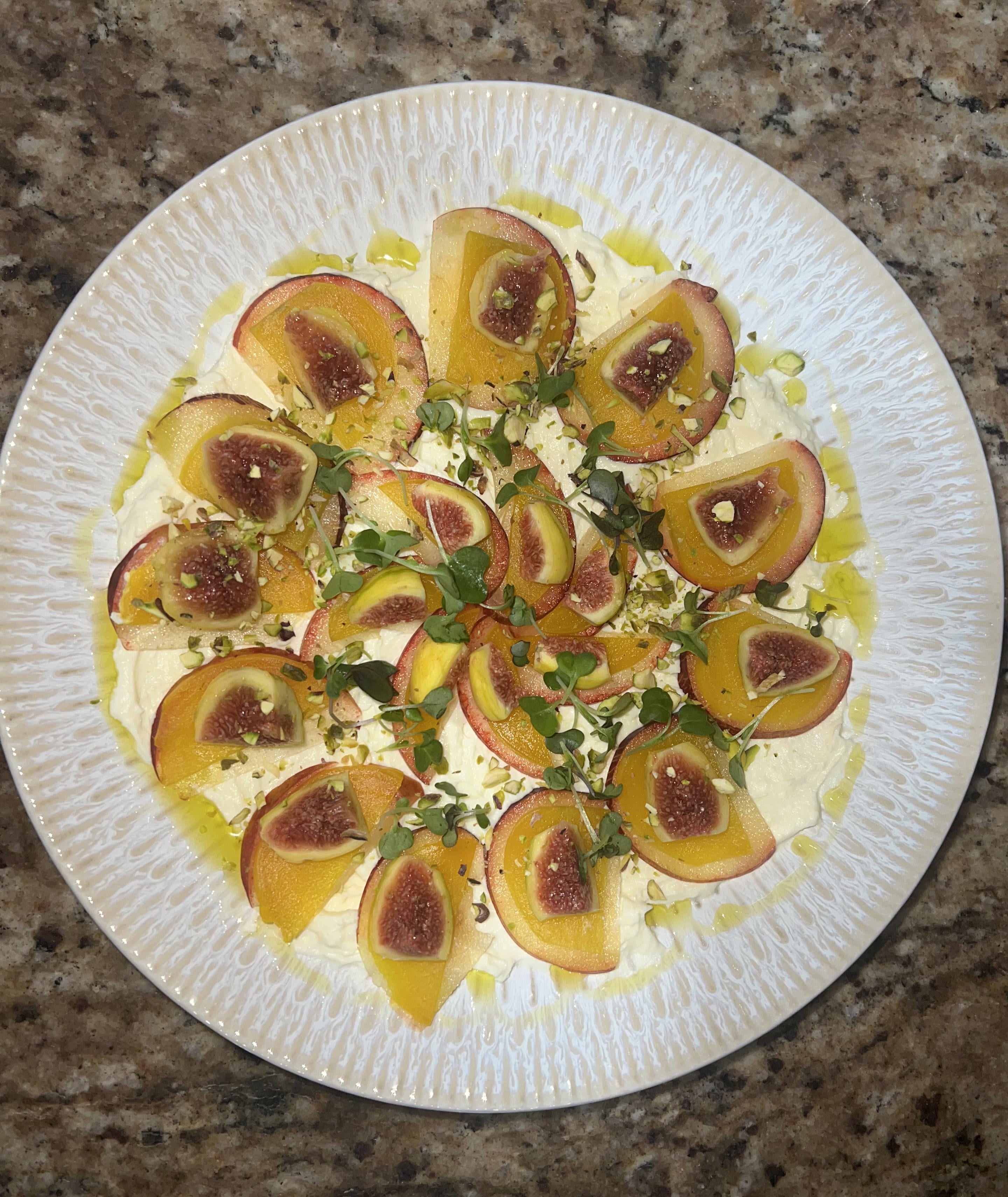 Figs, golden beetroot and peaches on whipped ricotta with Pistachio and microgreens