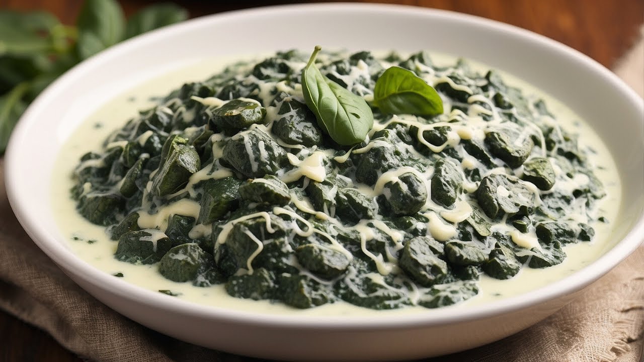 Creamy spinach recipe. Quick and delicious side dish. Ingredients: 2 tablespoons butter. One tablespoon olive oil. Three cloves garlic minced. One small onion finely chopped. 500g one lb fresh spinach washed. Stems removed. Or 300g frozen spinach thawed and drained. 1 cup heavy cream or half and half. Half a cup grated Parmesan cheese. 1/4 teaspoon nutmeg, optional. Salt and pepper to taste. Instructions. One, sauté aromatics. In a large skillet, heat butter and olive oil over medium heat. Add onion and cook 2 to 3 minutes until soft. Add garlic and sauté for 30 seconds until fragrant. Two, cook spinach. Add spinach in batches, stirring until wilted, if fresh or heated through if frozen. Three, make creamy sauce. Pour in heavy cream. Simmer gently for 3 to four minutes. Stir in Parmesan cheese and nutmeg. Four, season. Taste and add salt and pepper as needed. Cook another 2 to 3 minutes until thick and creamy. Five, serve. Transfer to a serving dish. Perfect as a side for chicken, fish, or steak. Cooking time. Prep 5 minutes. Cooking 10 minutes, total 15 minutes. Serving serves four people. If you enjoyed this creamy spinach recipe, please like and share this recipe with your family and friends. Thanks for watching.