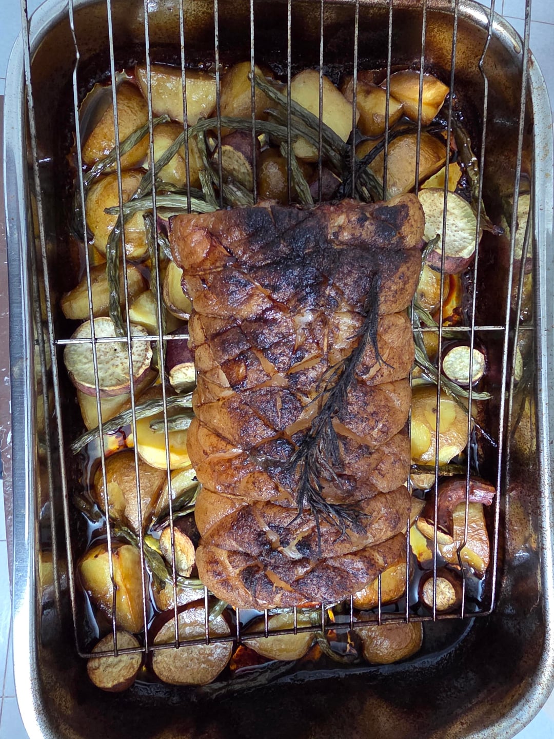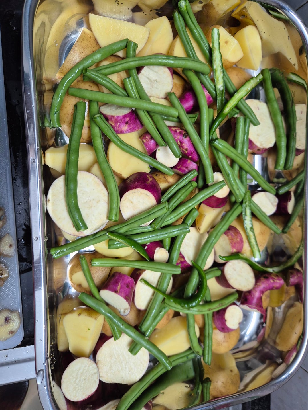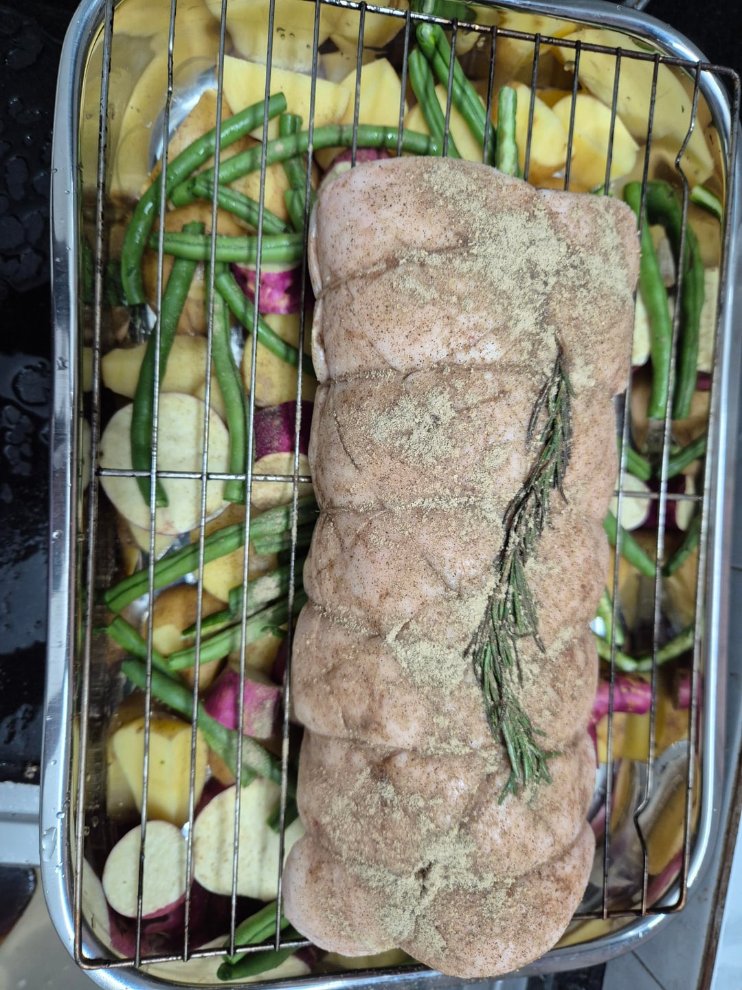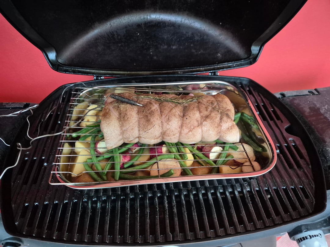 Weber Q3200 Tied Pork Shoulder over Assorted Potatoes, French Beans, Chillies and Stout Beer