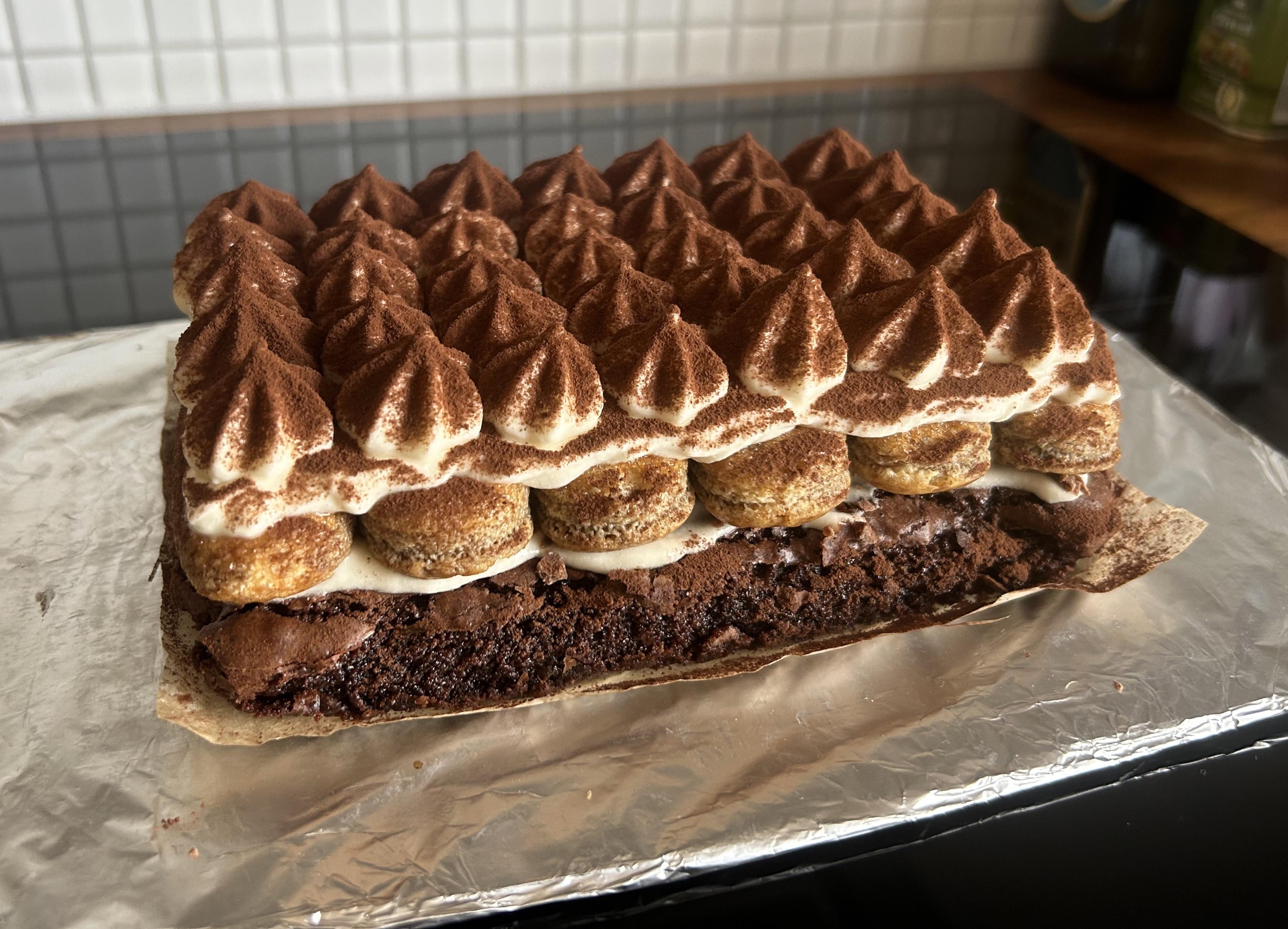 For this recipe, I did the brownie first and let it cool down before assembling the layers of tiramisu on top!