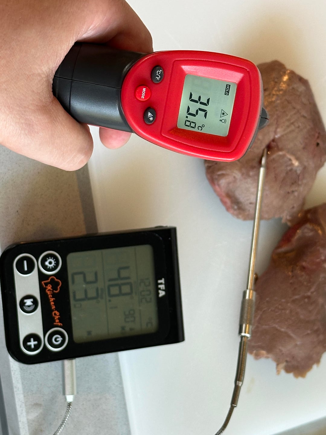The thermometer was not in the middle of the meat but closer to the pan (heightwise), to make sure that the whole thing wasn’t overcooked.