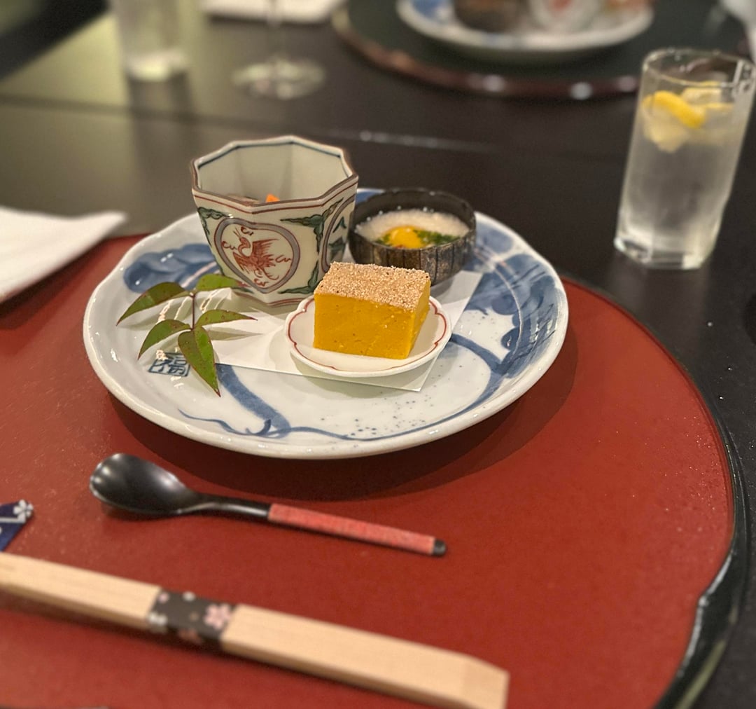 1. Goma tofu w soy based sauce 2. Mushroom in dashi, nagaimo w ikura and and kabocha “matsukaze” style 3. Matsutake and hamo dobinmushi w kabosu 4. Caledonian blue shrimp tempura 5. Maitake n shimeji tempura in nori shoyu looking sauce 6. Kamasu wrapped in shisho tempura 7. Aka amadai tempura 8. Renkon stuffed w mentaiko