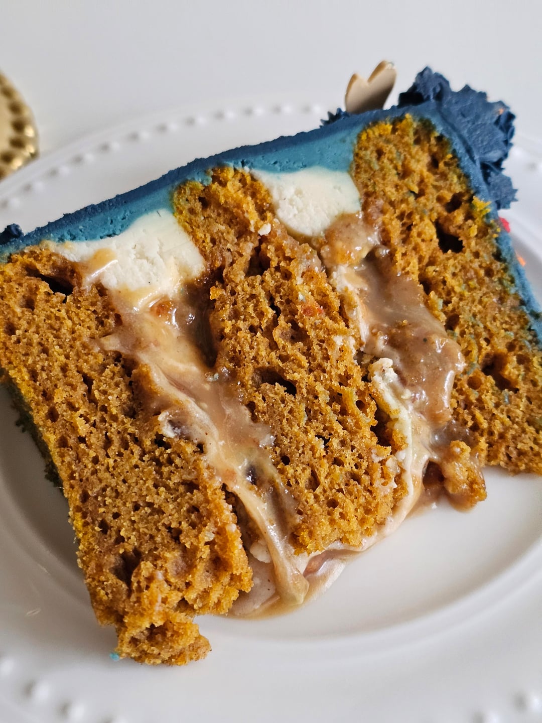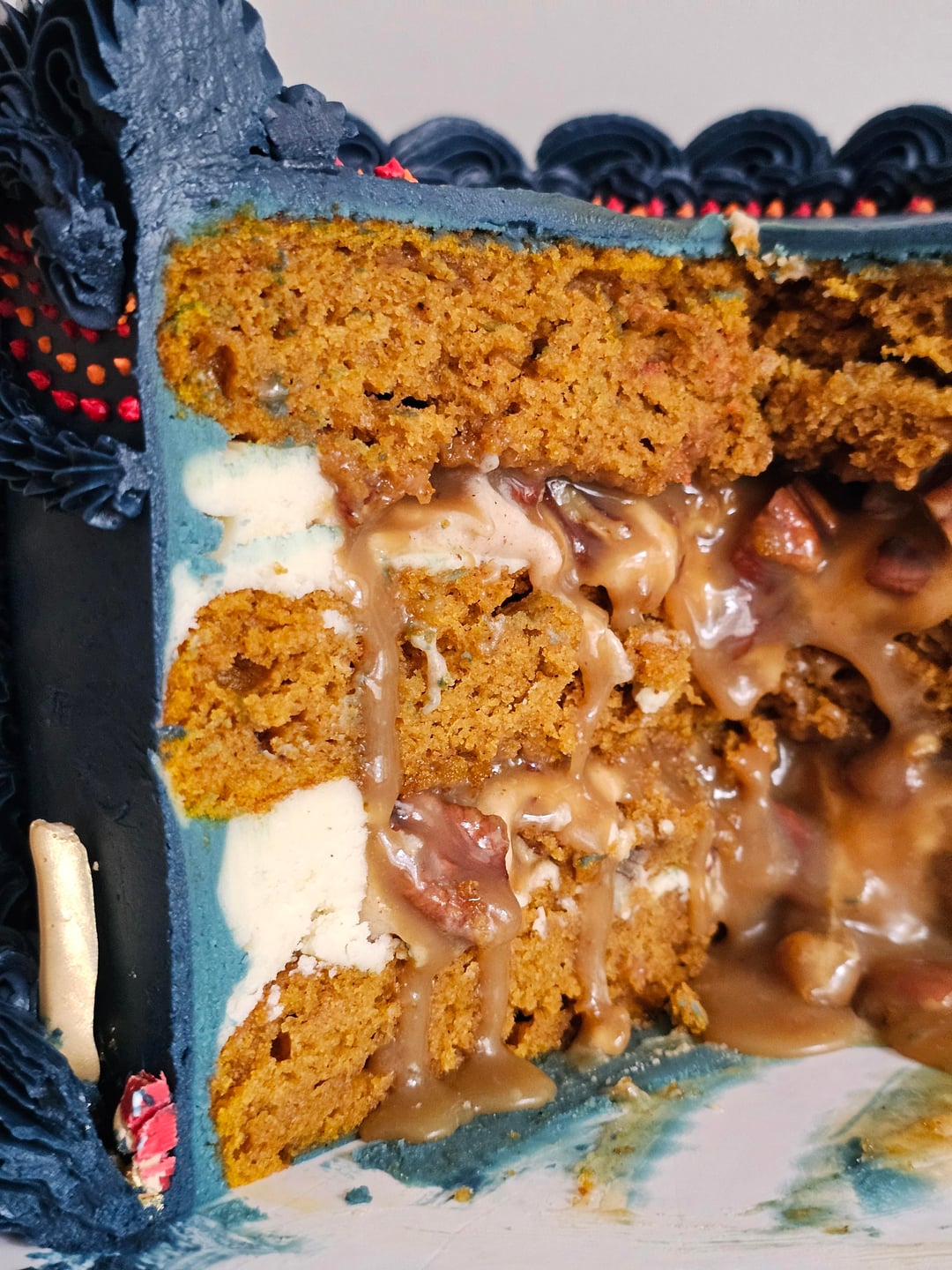 Pumpkin cake filled with cinnamon cream cheese frosting and pecan praline.