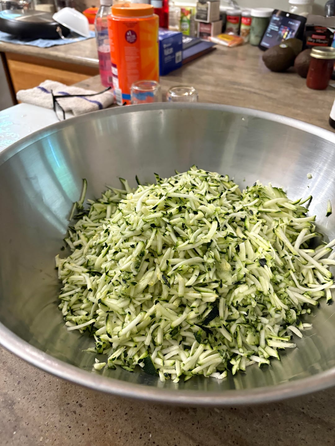 Photo Two: a giant silver prep bowl filled with shredded zucchini.