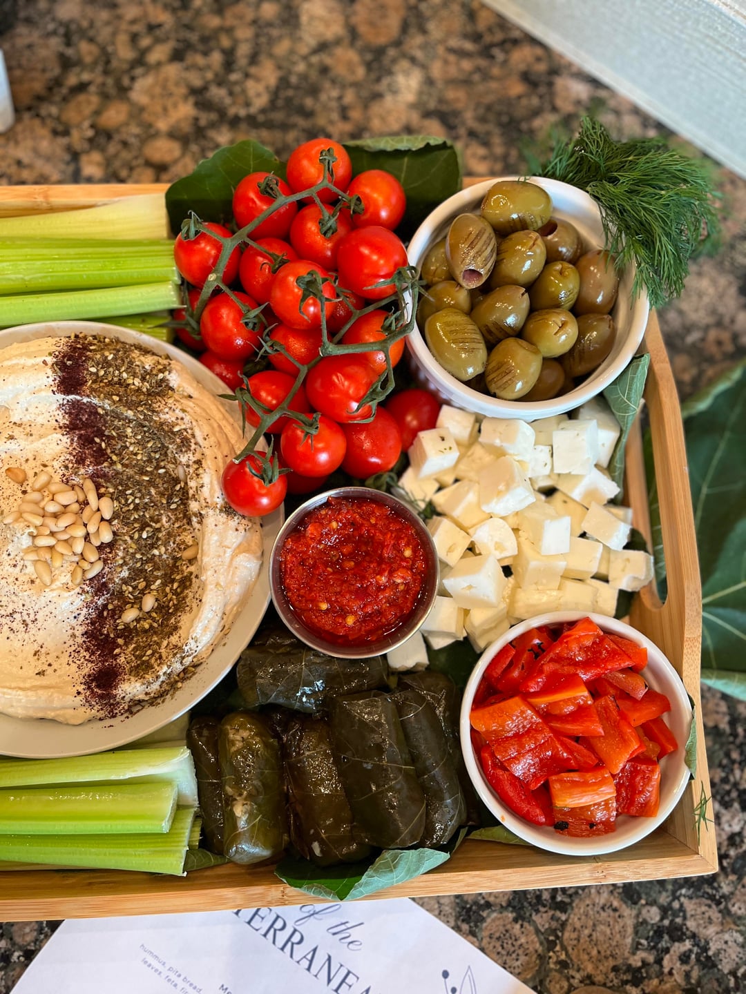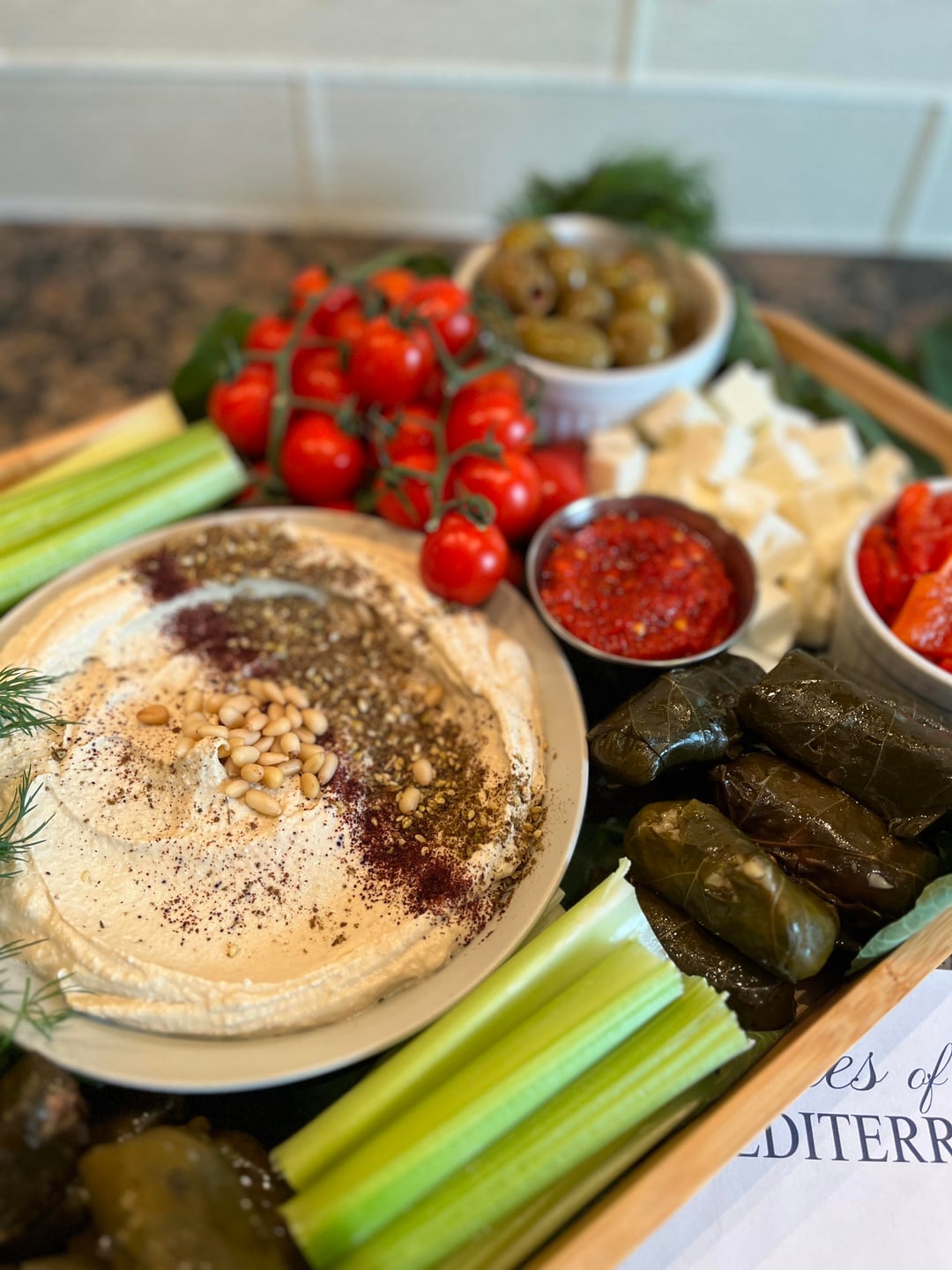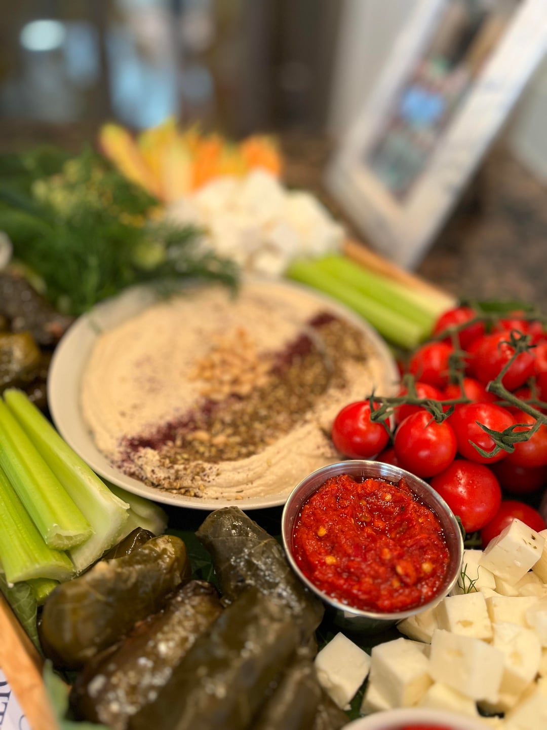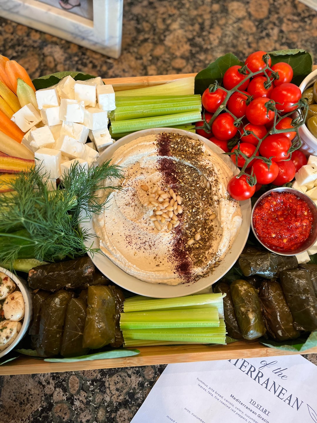 Mediterranean grazing board for a small gathering that I cooked for! For the cheeses I did marinated mozzarella, halloumi, and feta. I made homemade hummus and topped with pine nuts, za'atar, and sumac. Added some veggies/fruit like rainbow carrots, celery, cucumbers, roasted peppers and tomatoes. For heat I also added some Harissa paste. Then I added some Dolmas (stuffed grape leaves) and grilled Chalkadiki olives. A friend let me pick some fig leaves from her tree so I added them too to bring in the Med theme. Not seen in the pic is a separate small board with mini pita breads.
