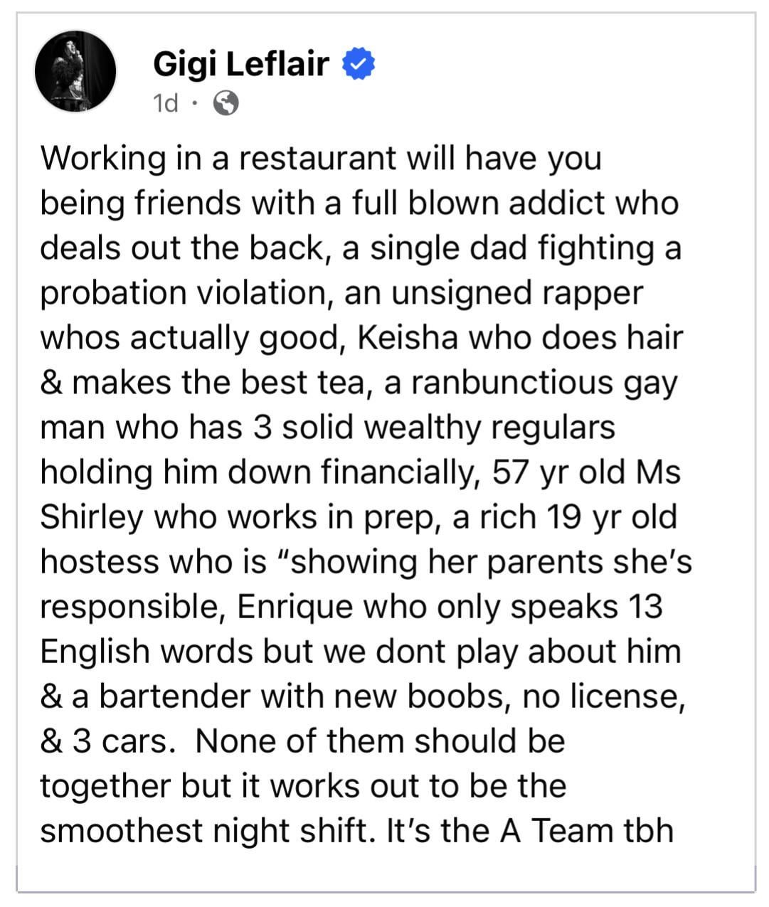 There’s the 60 something year old waitress that runs this shit like the navy, another waitress who only works a few days a week but is the only one actually organizing shit in the pit, the neurotic maintenance girl who is behind on her work because she’s doing literally everything else in this place, the super nice metalhead in the back, the disabled older guy that hangs with bikers, the line cook who facetimes his fiancee on the clock but he gets shit done and the goth in the dishpit that doesn’t talk to anyone but will drop everything if you need help.