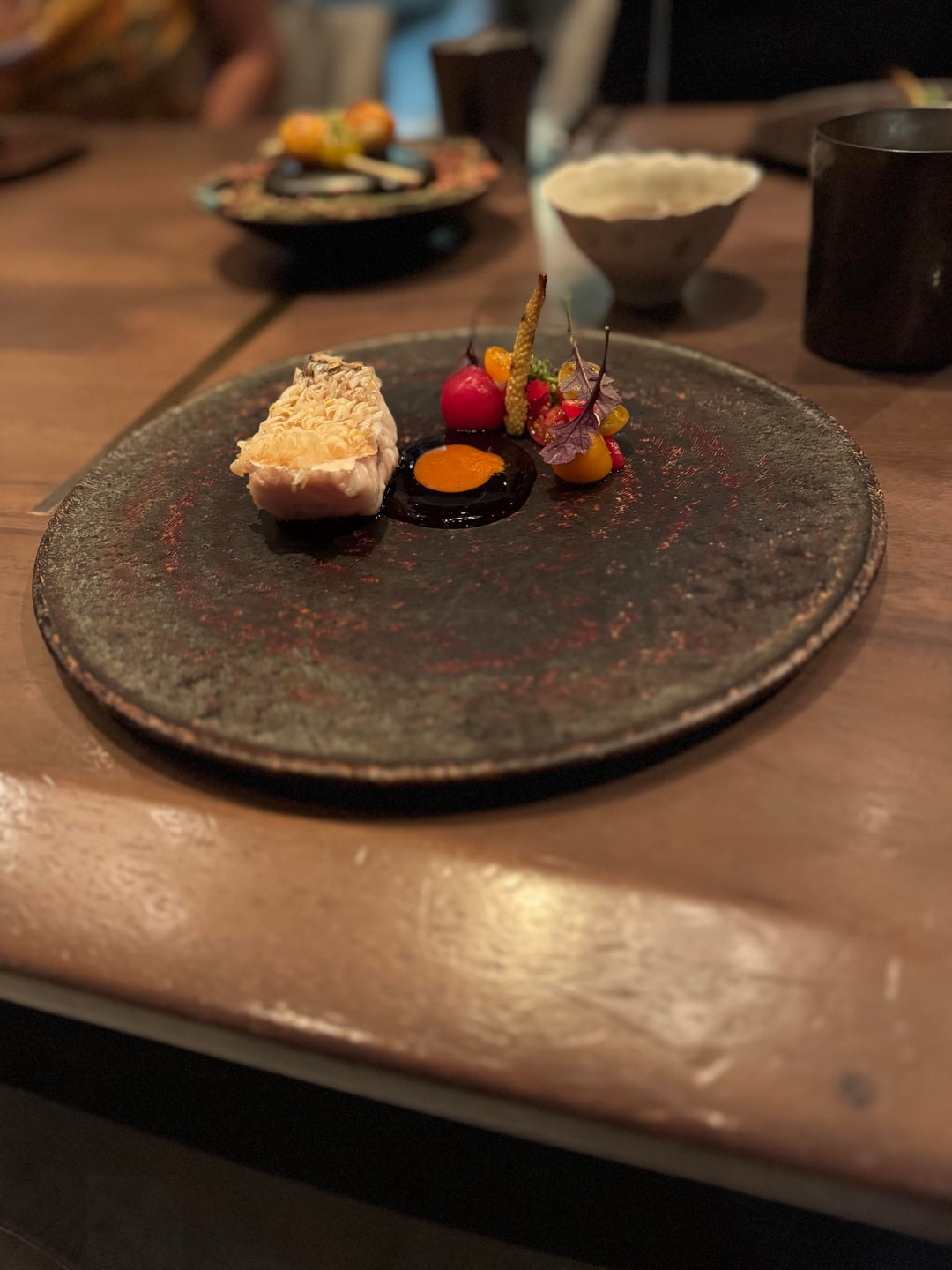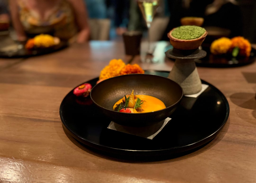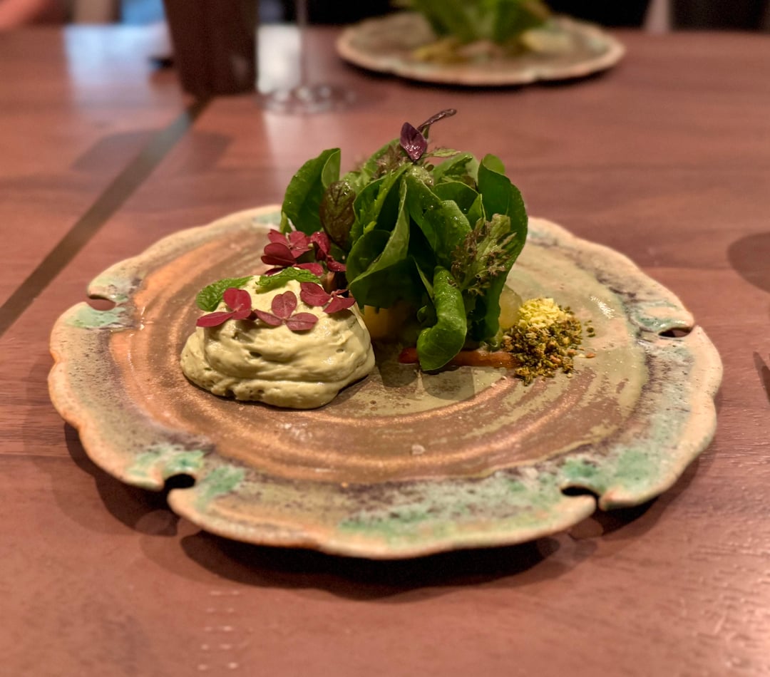 - Early Autumn in Sonoma – Stunning presentation – this first course consists of 10 individual bites that can be eaten in any order. While there were a few interesting bites here (the fig & beet presentation, Hokkaido scallop), overall the flavors were fairly muted & didn't bring the clean, vibrant pop I was expecting. They also served a fried squash blossom stuffed with cheese that was extremely satiating & rich, which caught me off guard this early in the meal.