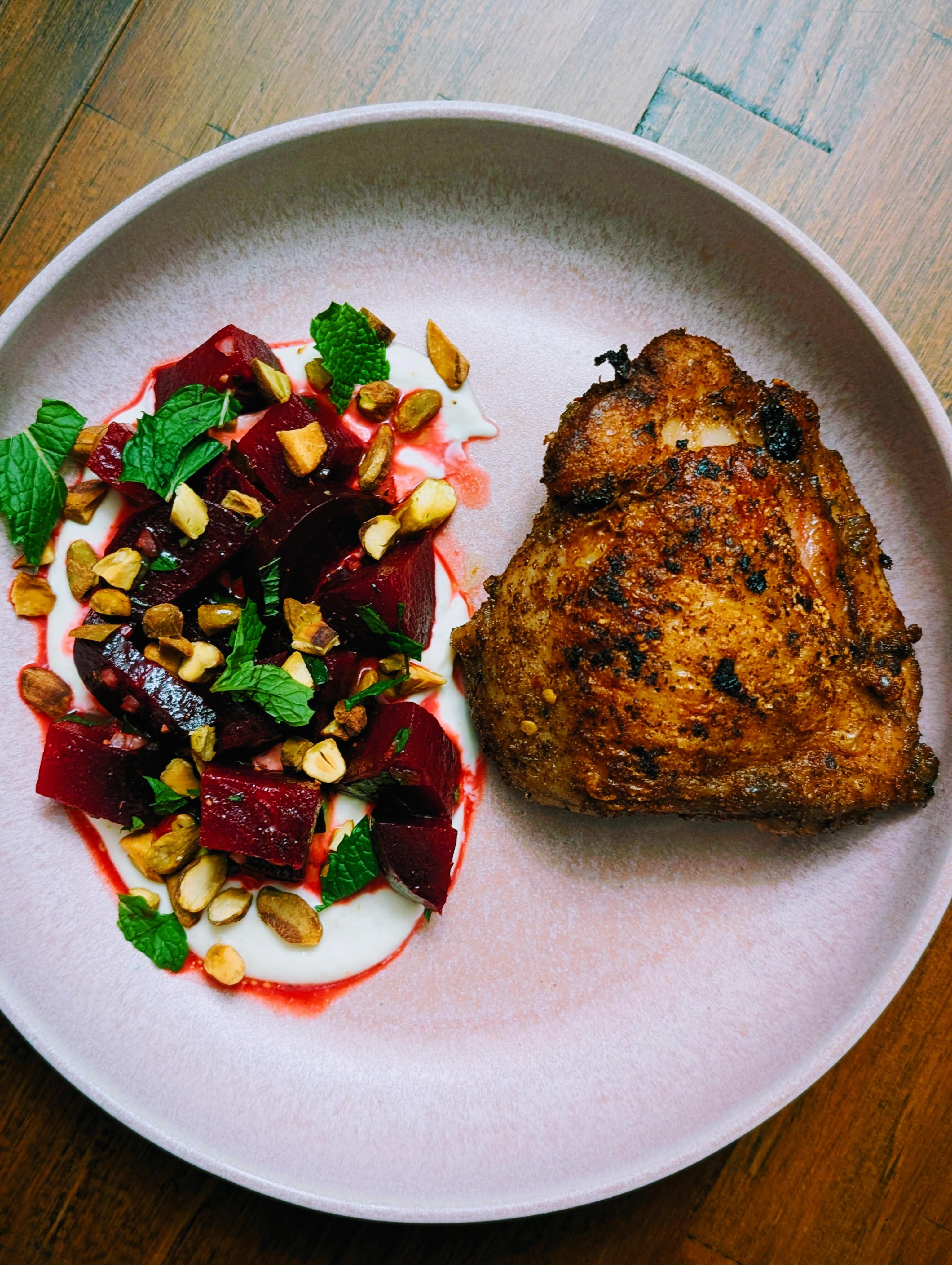 [recipe link](https://www.seriouseats.com/roasted-beet-salad-horseradish-creme-fraiche-pistachio-recipe)
