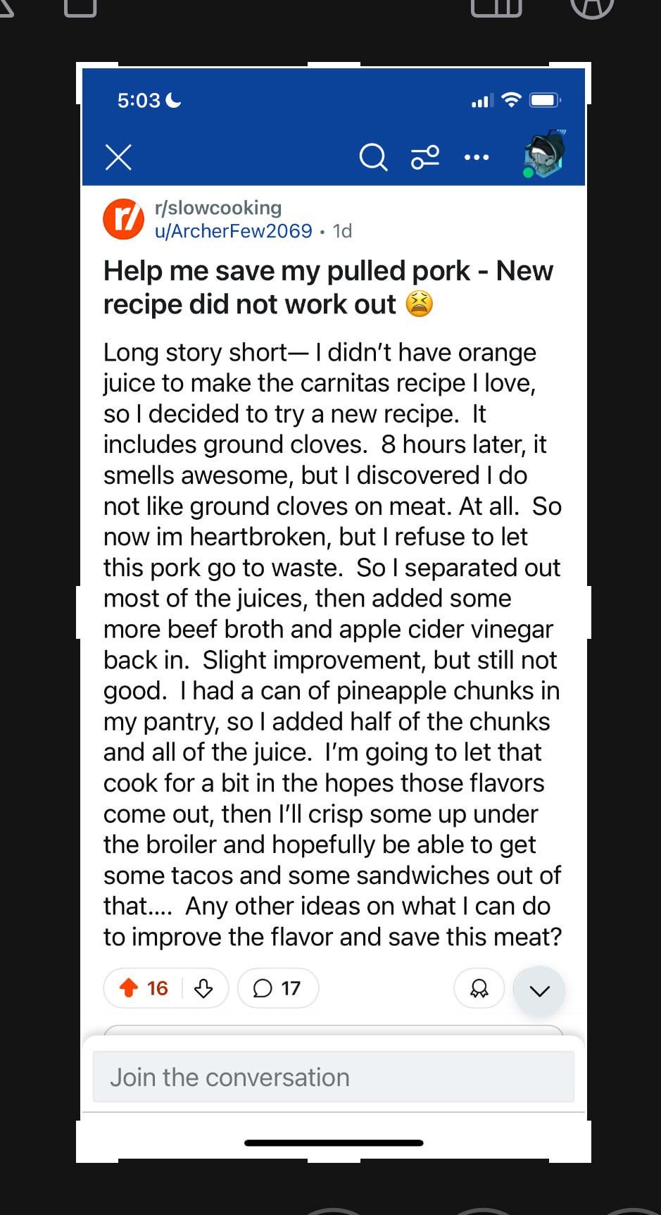 Just thought I’d post a quick update. After draining all of the original & replacement juices, I split the pork up into two batches, froze half of it and crisped up the rest in a skillet. I’m thrilled to report that that meat became the star of the most delicious burrito bowls, sharing the spotlight with an awesome cilantro jalapeño lime rice I whipped up from a new recipe (along with salsa, pico de gallo, avocado & Mexican crema). I also made some delicious tortas. I’m so relieved not only that I was able to save that pork, but that it is delicious in meals I look forward to eating. 😋