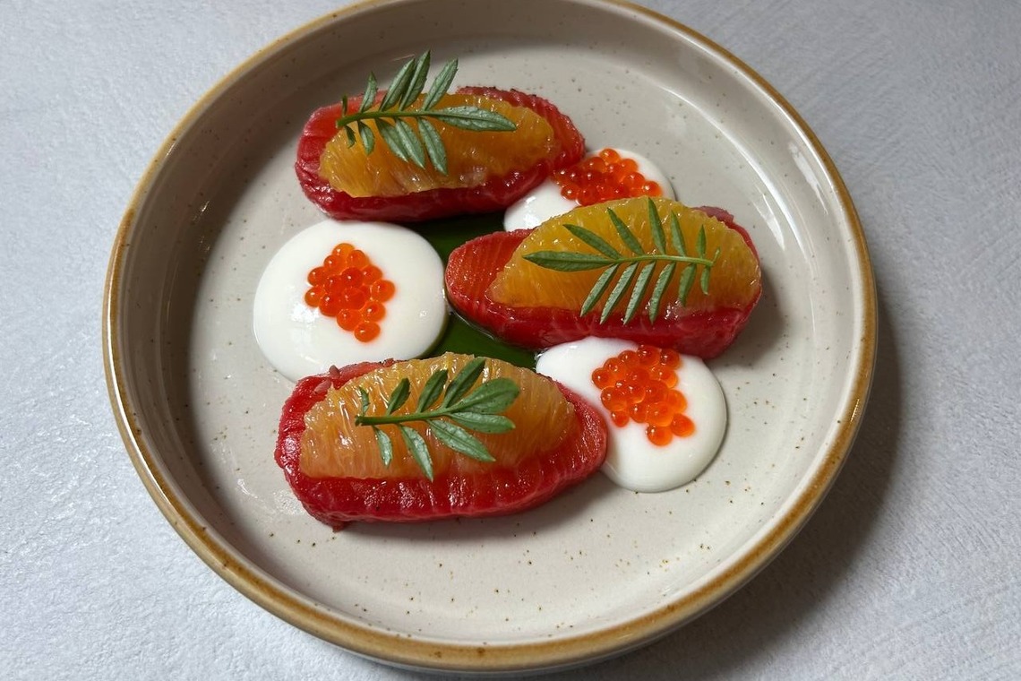 It gets better. I start my meal with three plump slices of New Zealand salmon cured with beetroot and topped with orange segments that add a splash of bright acidity. Tiny puddles of buttermilk supply a creamy tang, while pearls of salmon roe burst with briny flourish.