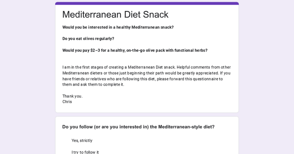 Hi, I would like to know if you could fill out this Google form survey about a snack that caters to the Mediterranean diet. This is an early stage of the snack, and I would like to get any feedback and advice on making the snack. This is a passion product that I would love to make, and I hope to one day make this snack. Many thanks!
