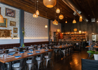 “Because you don’t have plants in restaurants that often, right off the bat, it gives it this really comfortable vibe when you walk in,” he says. “It adds a little bit of vitality and texture to this space, which is tall and all wood and brick.”