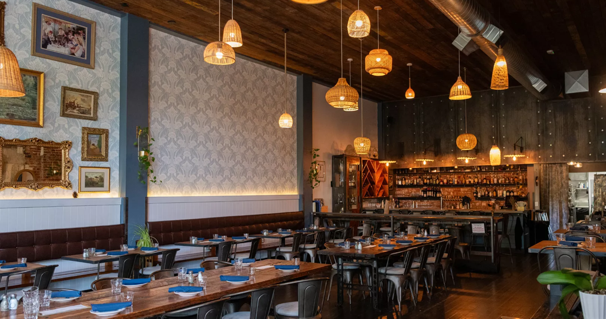 Adding to the sense of homestyle warmth is the lighting from wall sconces and pendant wicker lamps. Their golden glow illuminates a large floral mural with the base of the Eiffel Tower at its center. On the same brick wall, attentive diners might even spot the faded lettering of Casper Fry, the restaurant that occupied this space in the South Perry District before Francaise took its place two years ago.