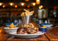 Dry-aged pork ribeye (center), with other French-inspired eats to round out your meal.