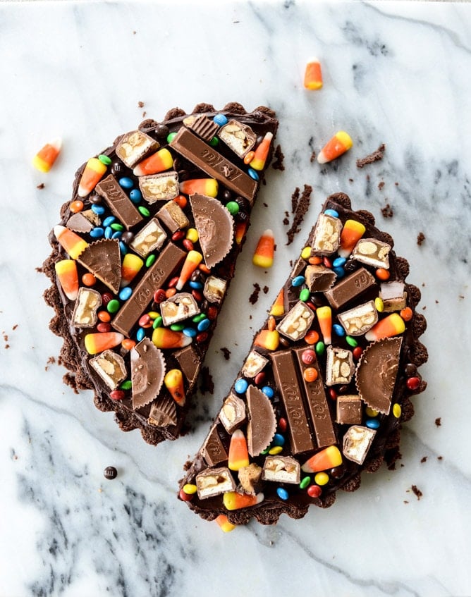 Use some Halloween candy for this peanut butter nutella brownie tart!