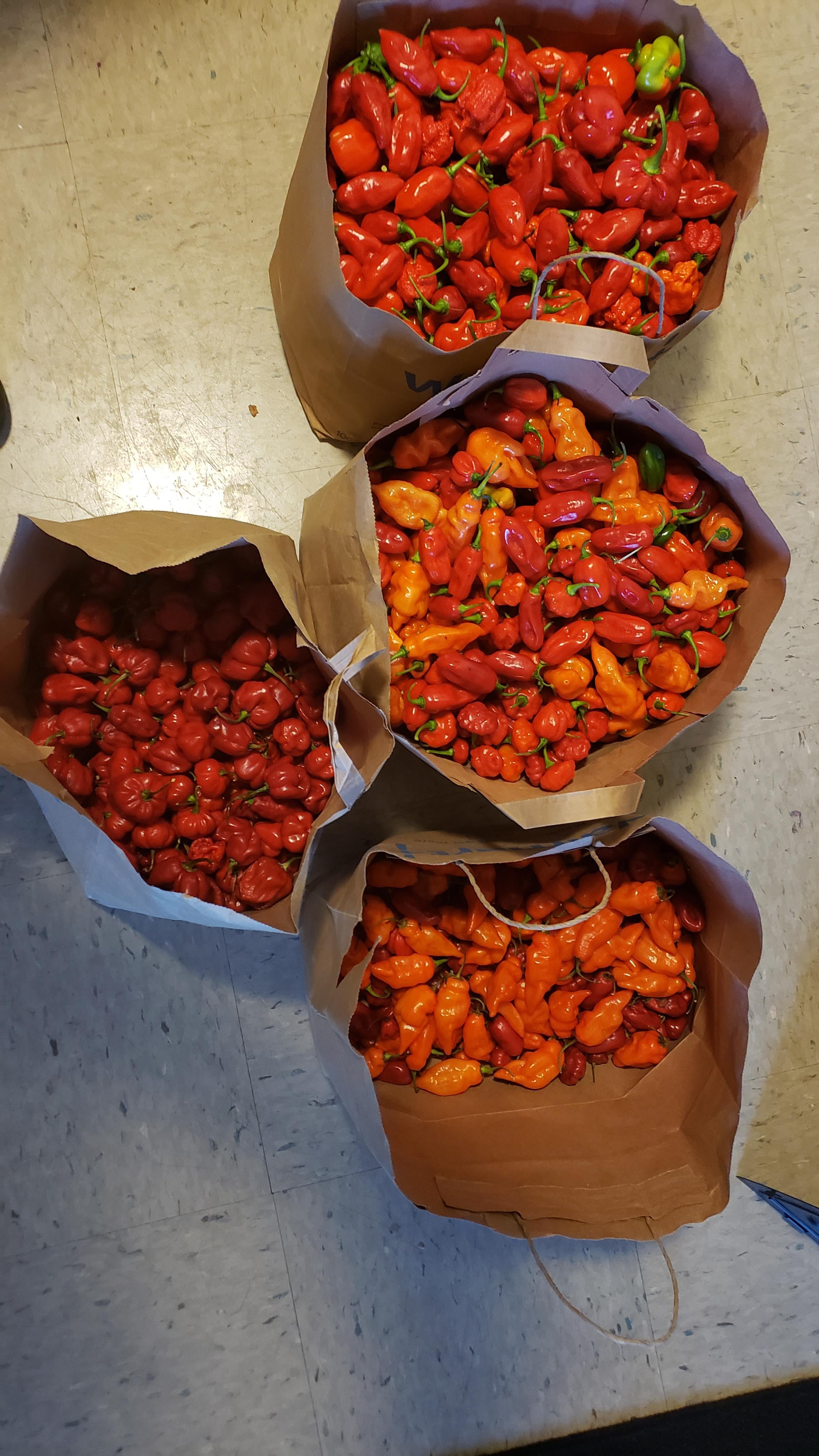 Five gallon bucket of puree plus vinegar. A stable base for sauce as you need it.