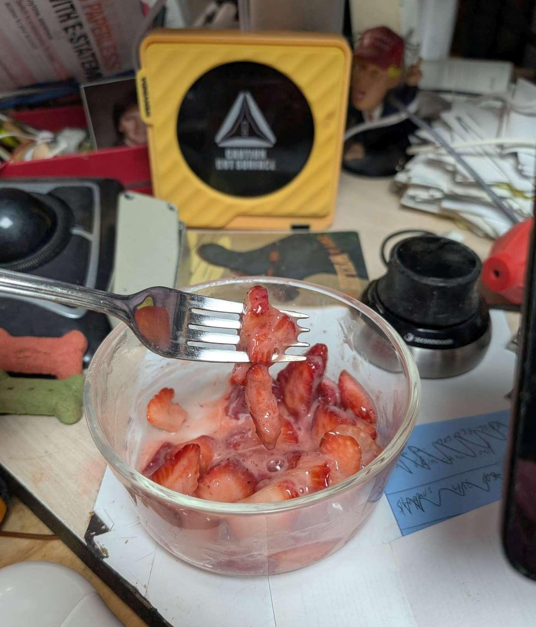 I don't care for plain fresh strawberries unless they're almost too ripe. I need the sweetness of sugar. Today though, I had leftrover donair sauce, a sweet & garlicy mixture that goes perfectly with the meat in a Halifax-Style Donair.