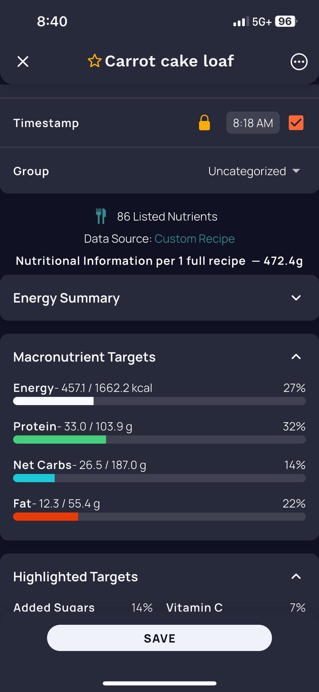 Carrot cake loaf 457 cal with icing (entire loaf) 33g protein 16g fiber only 4g added sugar by Maleficent_Cost8926 1 Comment sunchaser82 16 hours ago Please drop the recipe!