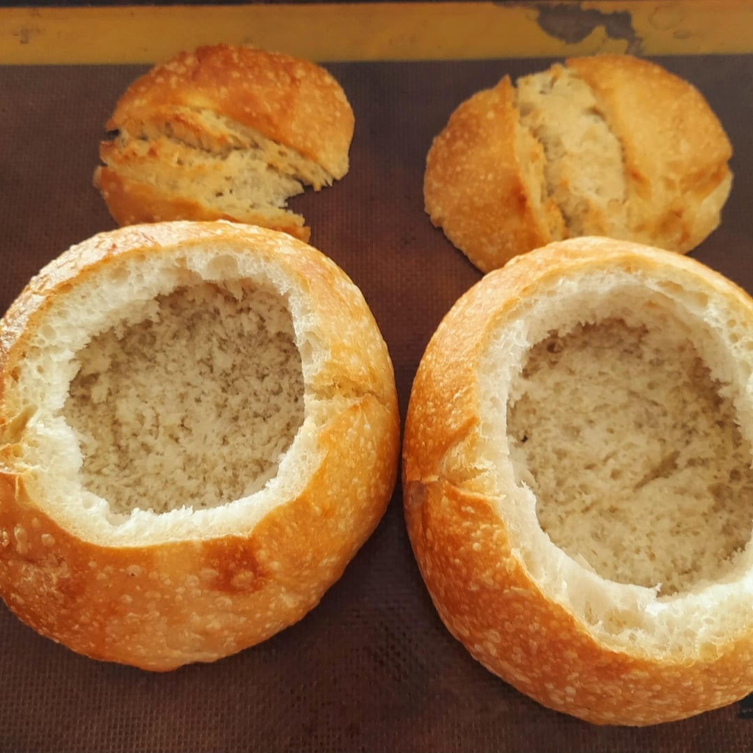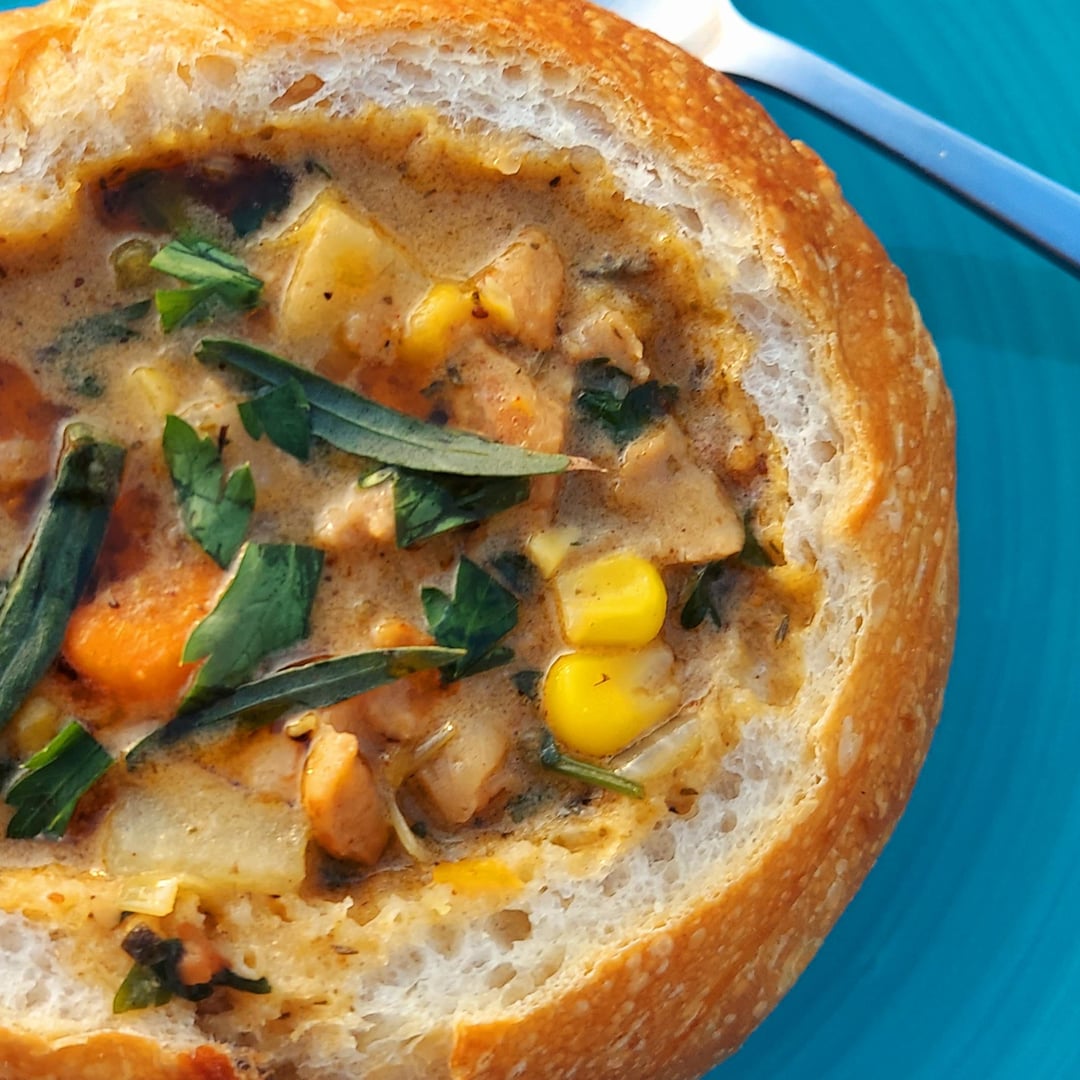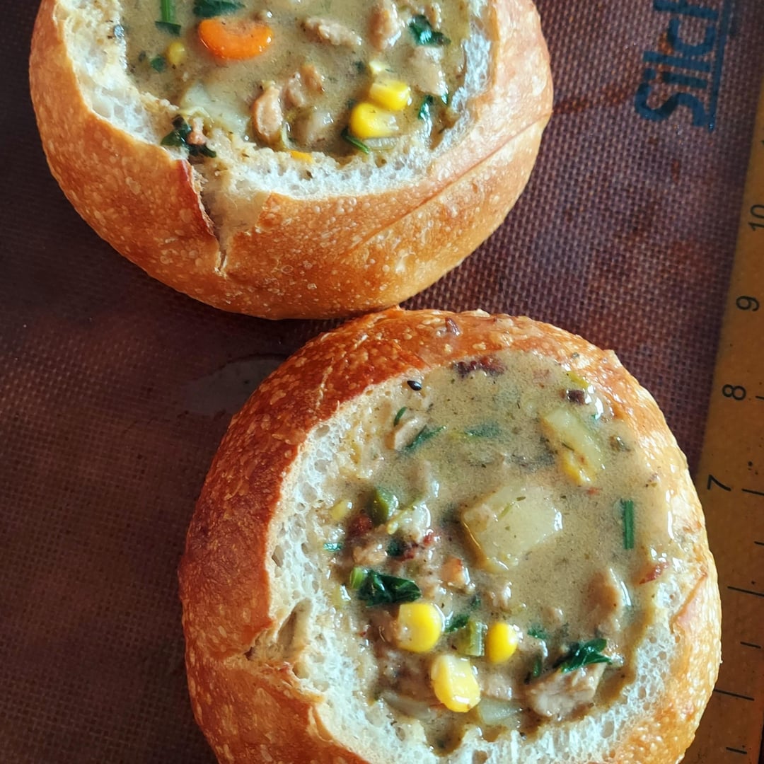 Seafood chowder with soy curl clams and a TJ’s bread bowl hack