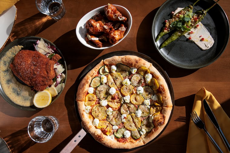Menu highlights: Calabrian wings; hoagie wedge; mushroom duxelle sandwich (lunch); stuffed long hots; pizzas (zucchini; rabbit pizzaiola; hazelnut-poblano pesto; peach and Taleggio); corn risotto; chicken riggies; sesame gemelli; pork Milanese; NY strip; sea bream; pizza fritta.
