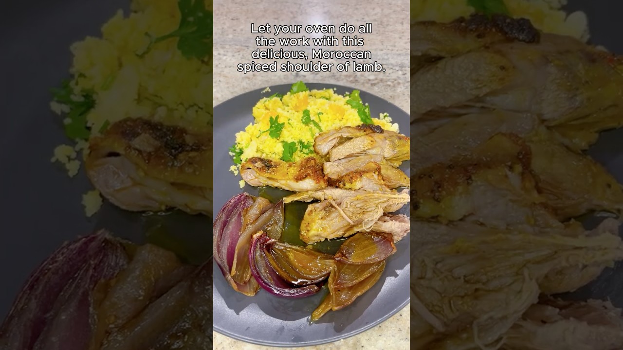 Let your oven do all the work with this delicious Moroccan spice shoulder of lamb. Prepare the marinade. Mix until well combined. Score the lamb shoulder. Then rub the marinade all over. Place the red onion wedges around the lamb. Cover and roast for 3 hours. Let the lamb and onions onto a board and rest. Prepare the couscous. Add boiling water to cover the couscous. Fluff the couscous up. Then add lemon juice, salt, herbs, and almond flakes. [Music] Serve the lamb with couscous and onions. Enjoy this delicious