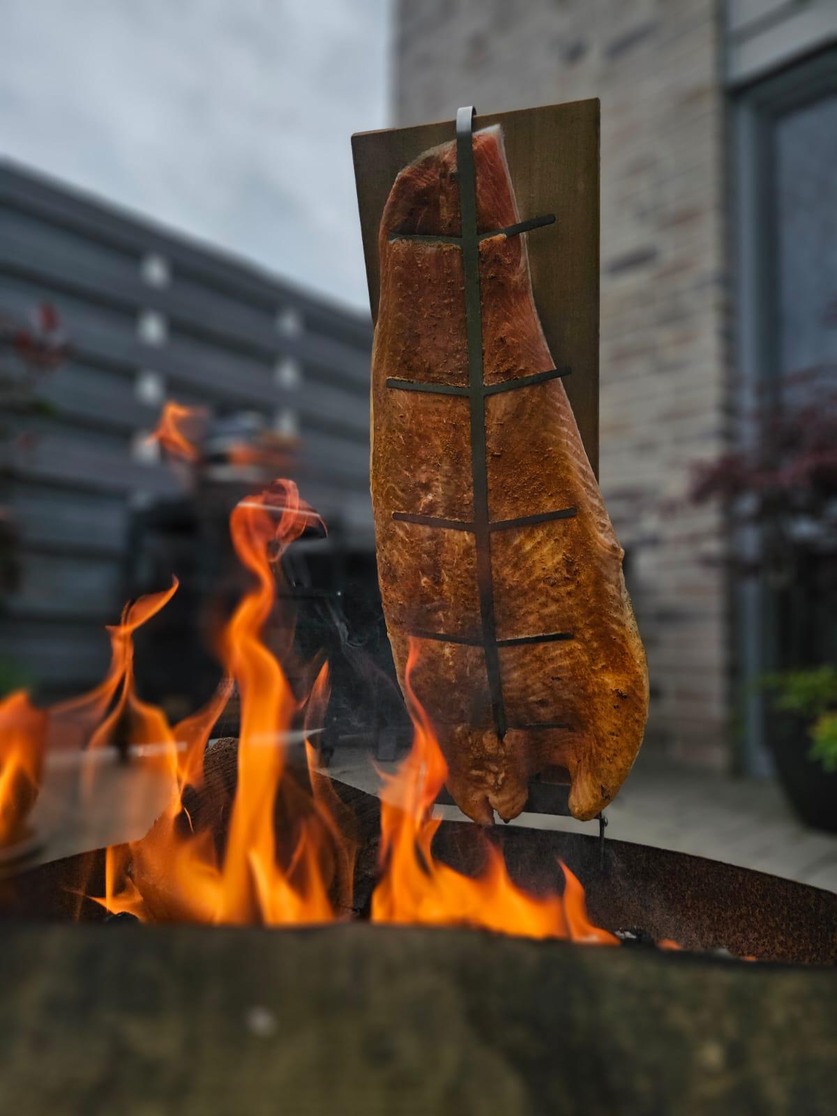 SRDCMarine 4 weeks ago I’ve never seen salmon (?) cooked like this. Is that nearly upside down like at a 45* angle?What’s the recipe and why cook in this manner? Very interesting ( and great photo!).